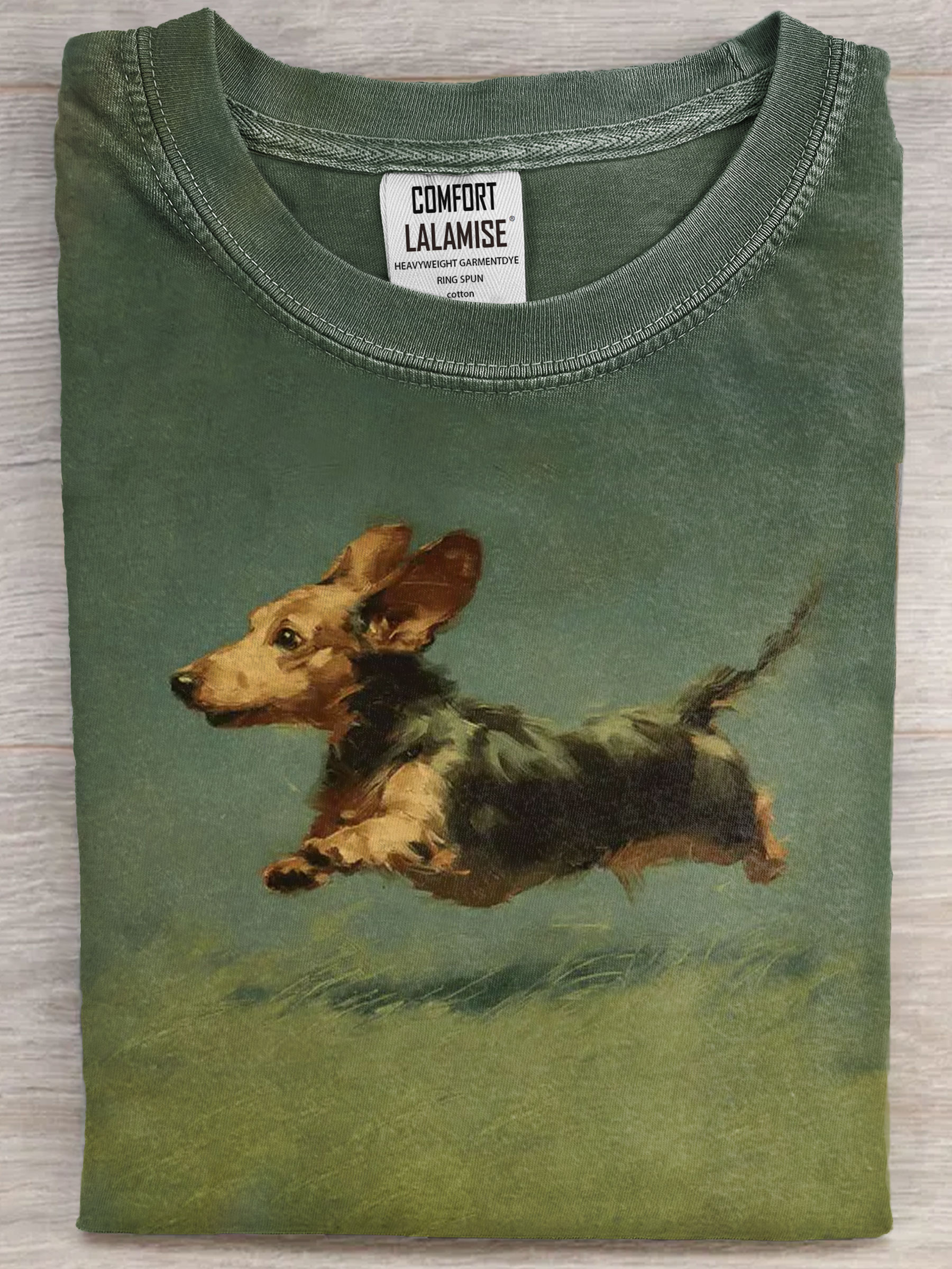 Vintage Running Dog Art Print Casual Short Sleeve T-shirt