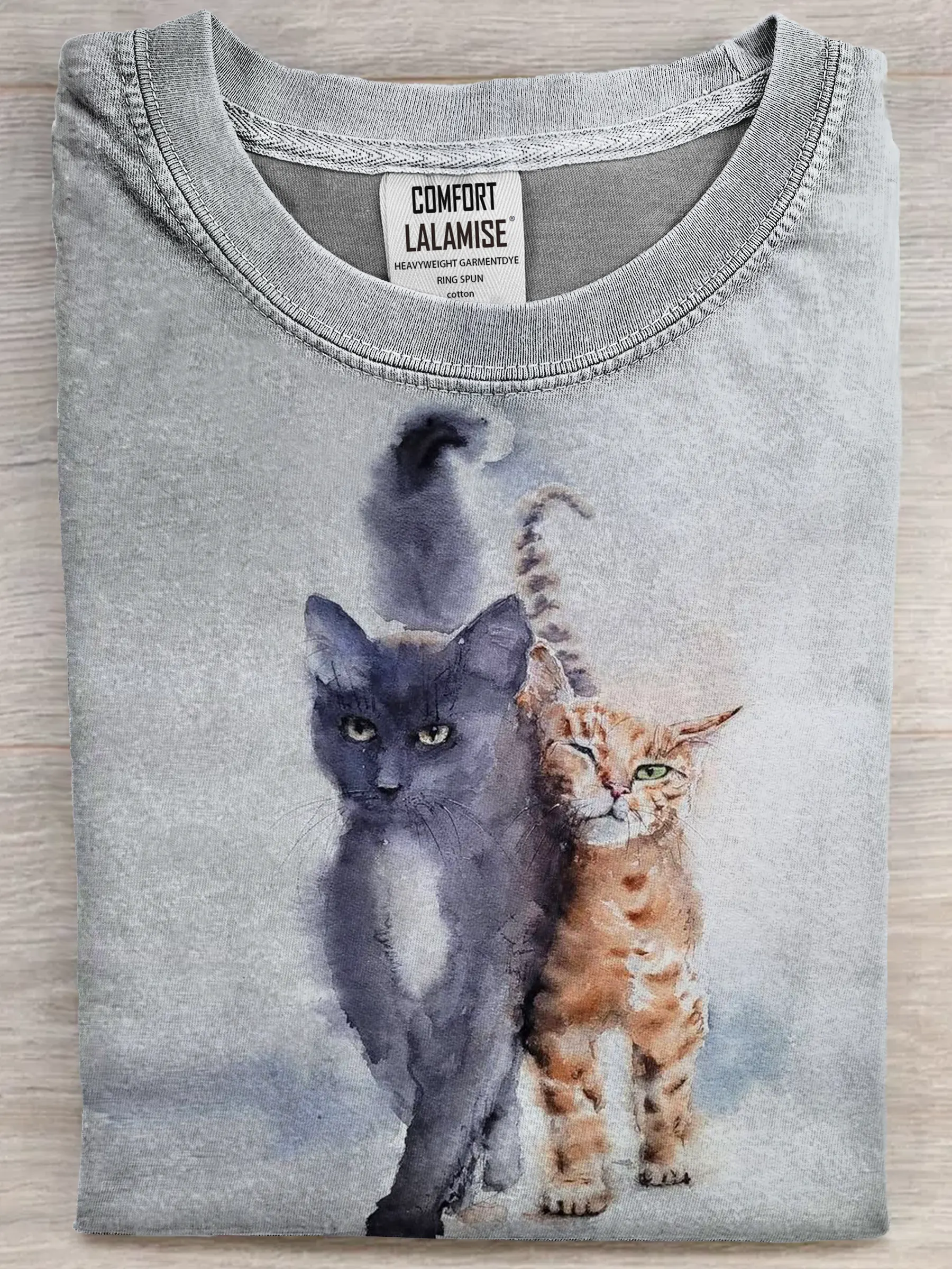 Funny Retro Couple Cat Art Print Casual Cotton Short Sleeve T-shirt