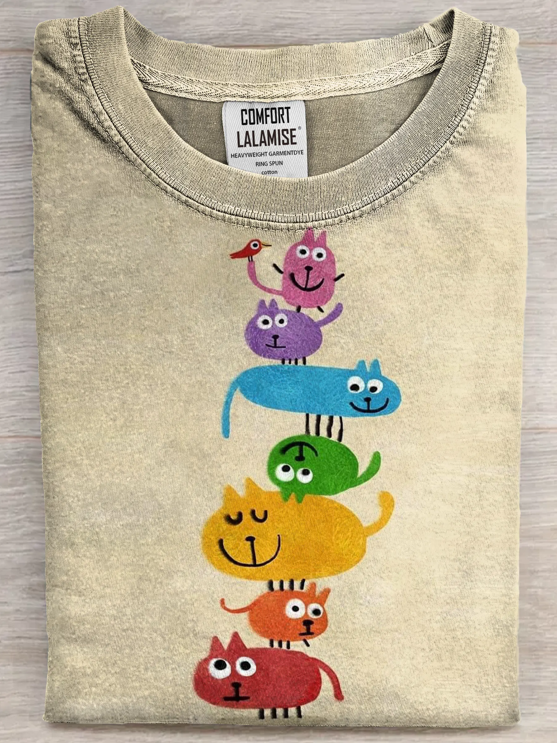 Funny Retro Multicolor Cat Art Print Casual Cotton Short Sleeve T-shirt