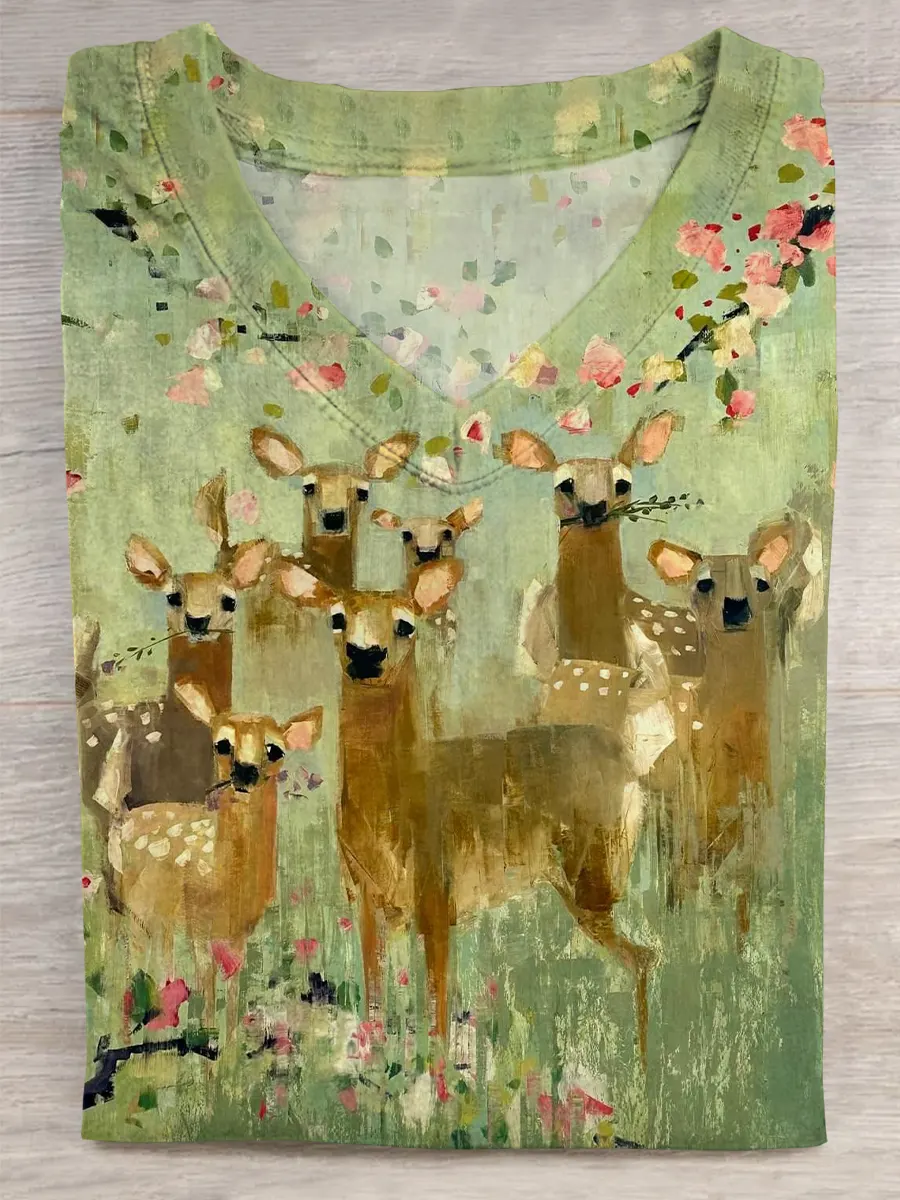 Men's Casual Retro Deer Floral Art Print Cotton V-neck T-shirt