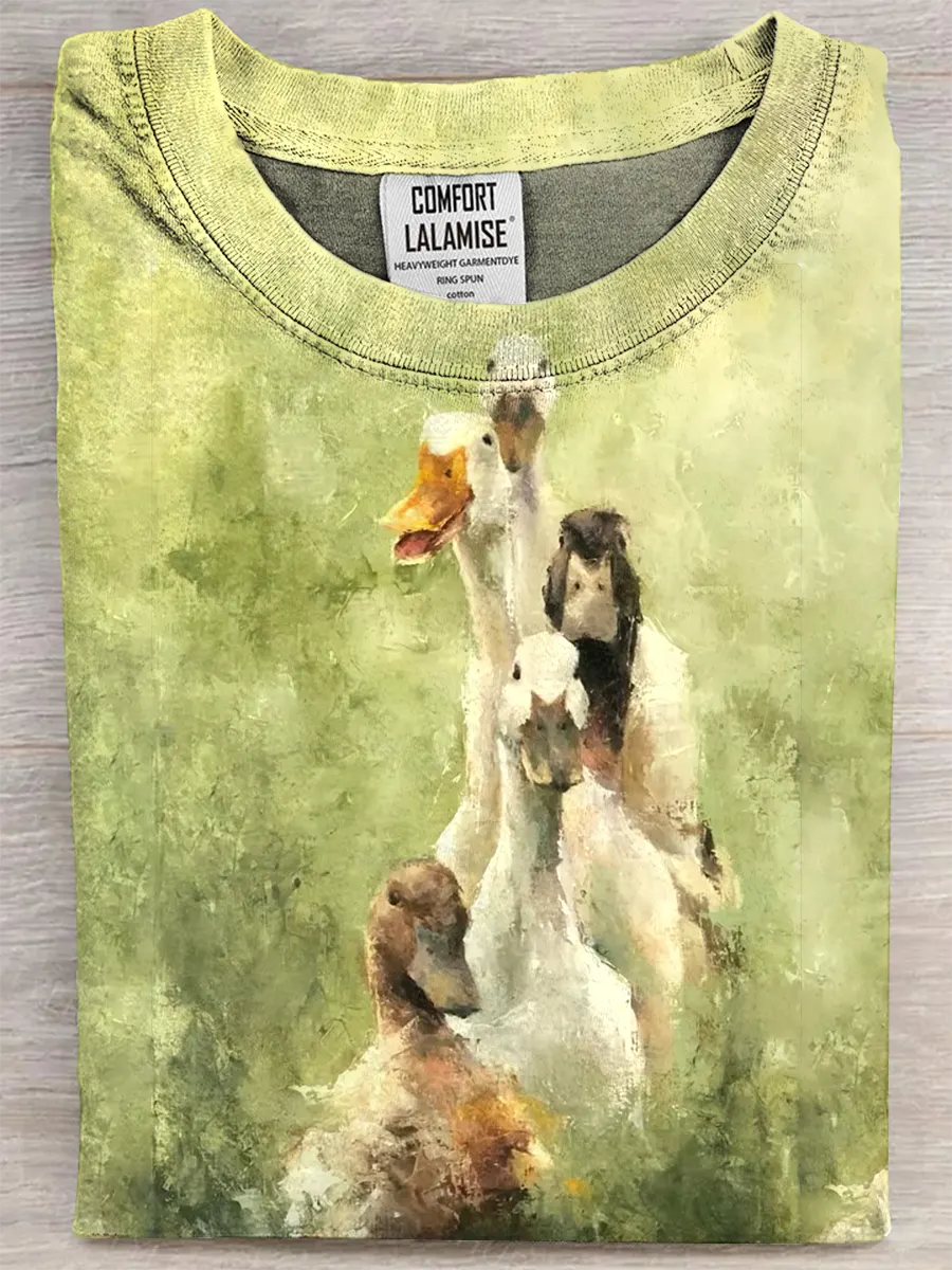 Retro Duck Art Print Casual Pure Cotton Short Sleeved T-shirt