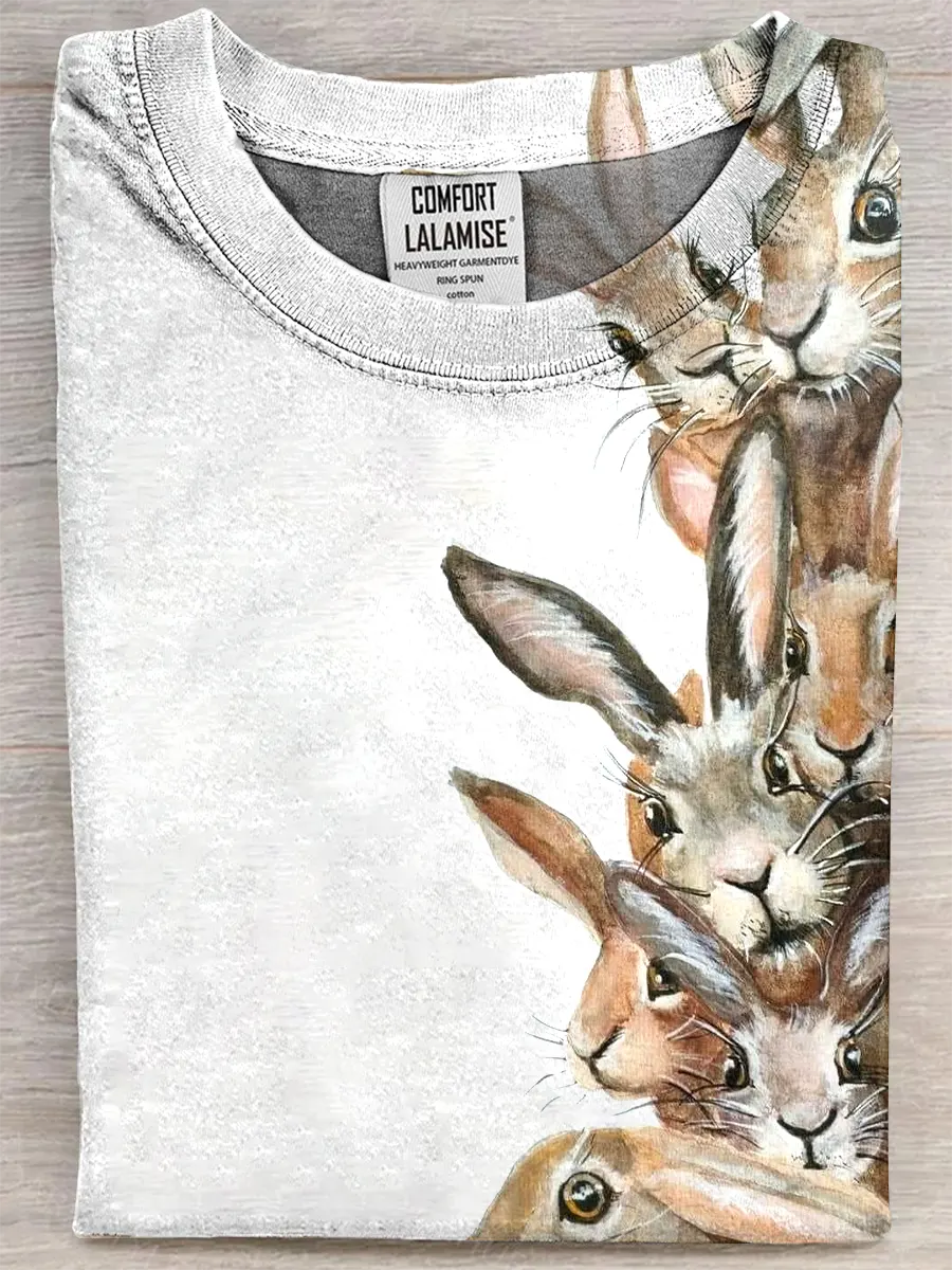 Retro Cute Rabbit Art Print Casual Pure Cotton Short Sleeved T-shirt