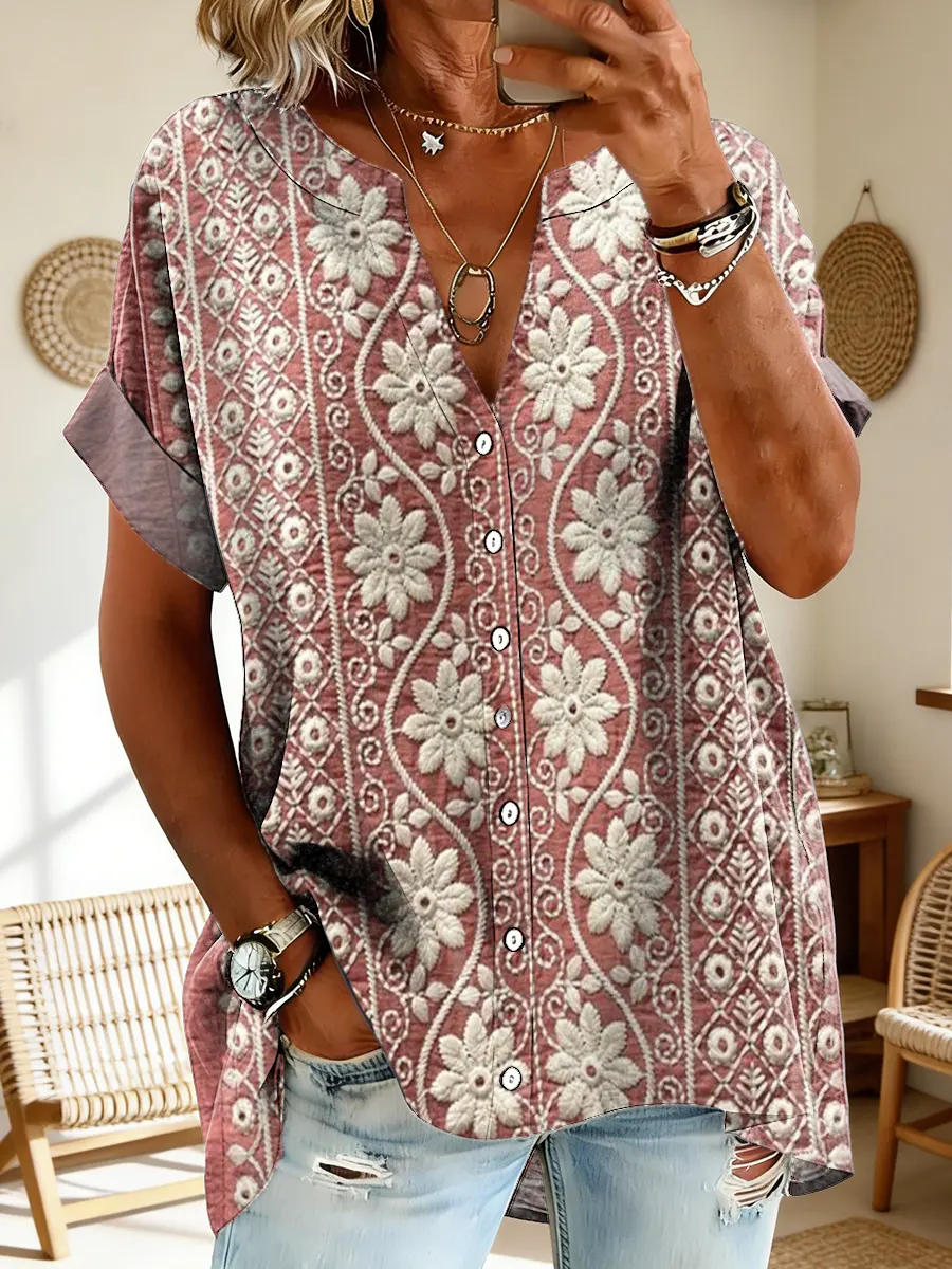 Women's Ethnic Floral Art Print Zipper Pocket Short-Sleeve Cotton Shirt
