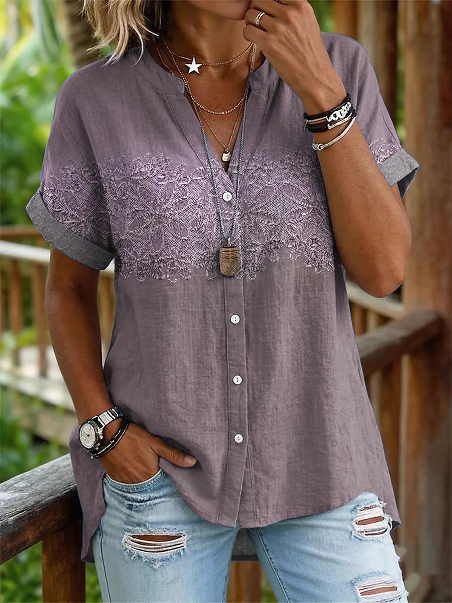 Women's Retro Bohemian Floral Art Print Casual Short-sleeve Round Neck Pleated Cotton Linen Shirt