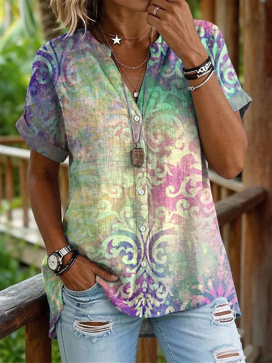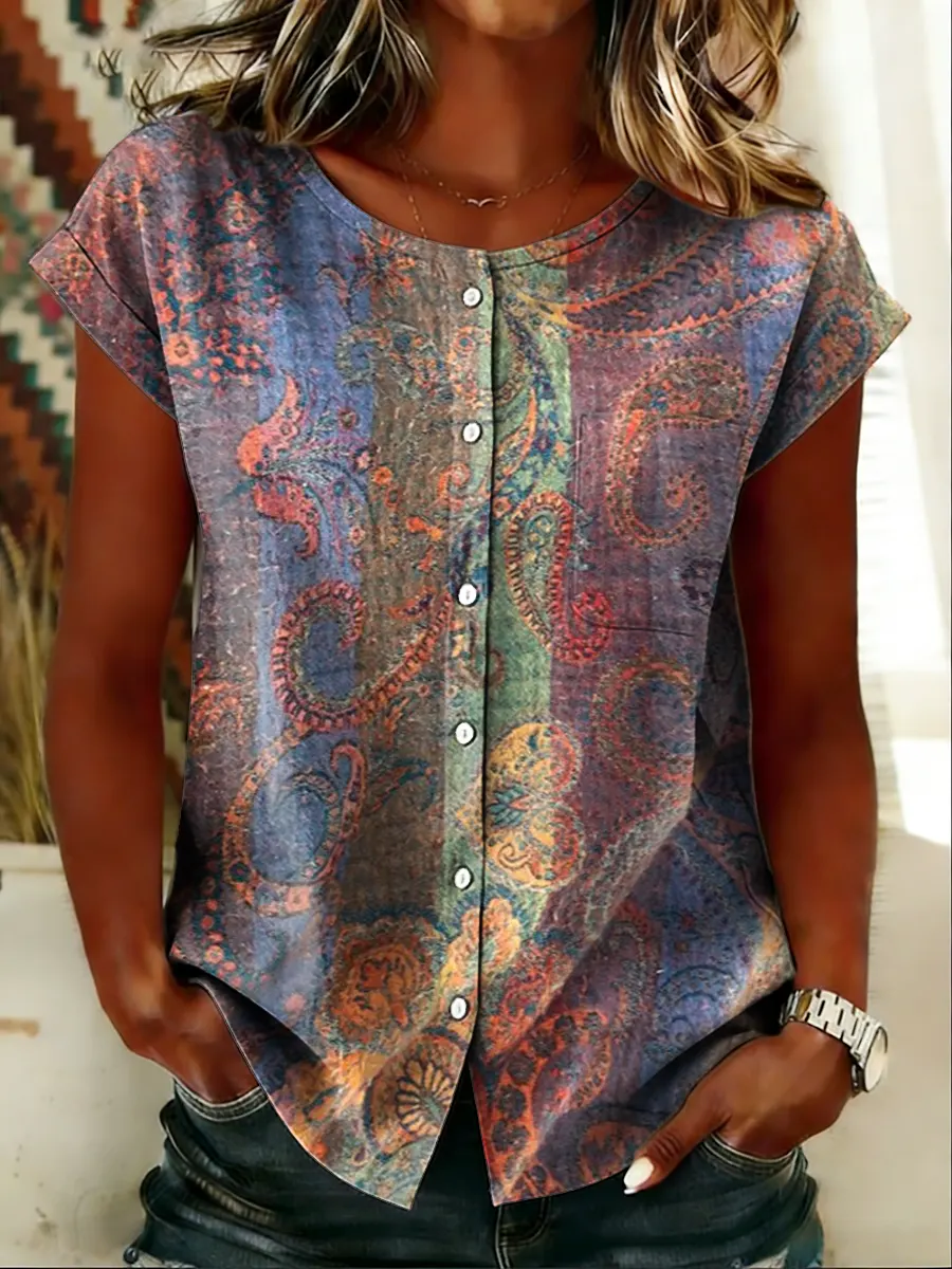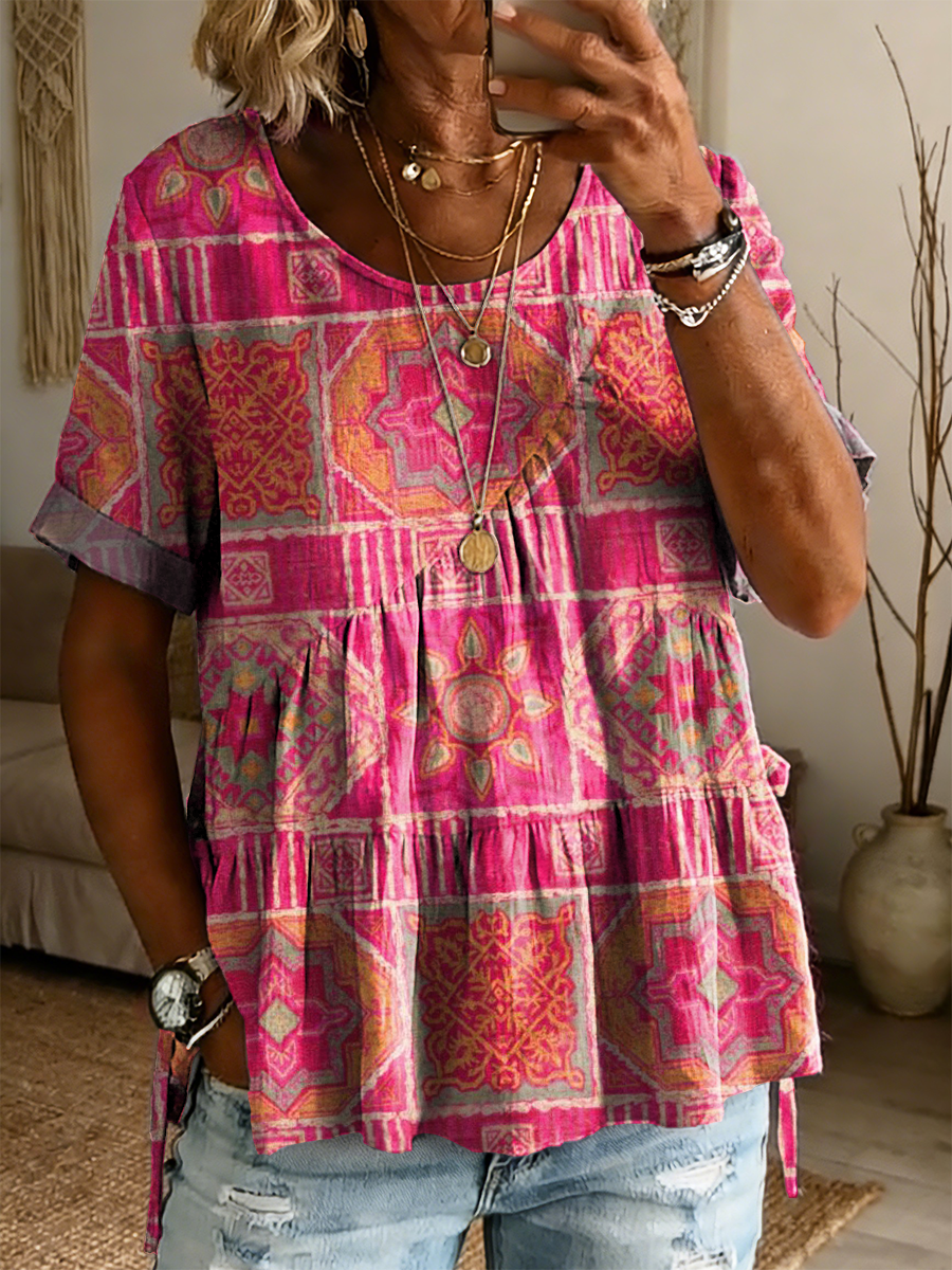 Women's Retro Bohemian Art Print Casual Short-sleeve Round Neck Pleated Cotton Linen Shirt