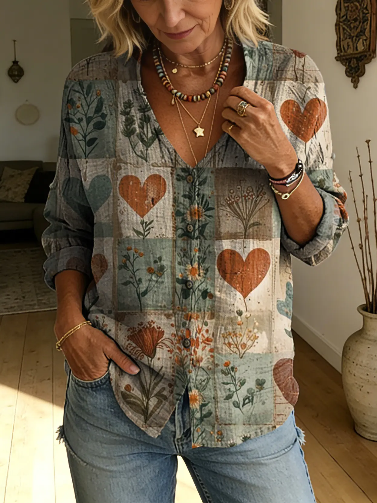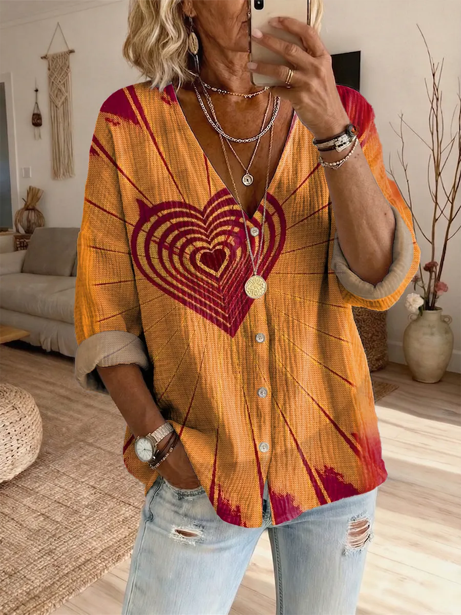 Women's Retro Colorful Heart Art Print Casual Long-sleeve V-neck Shirt