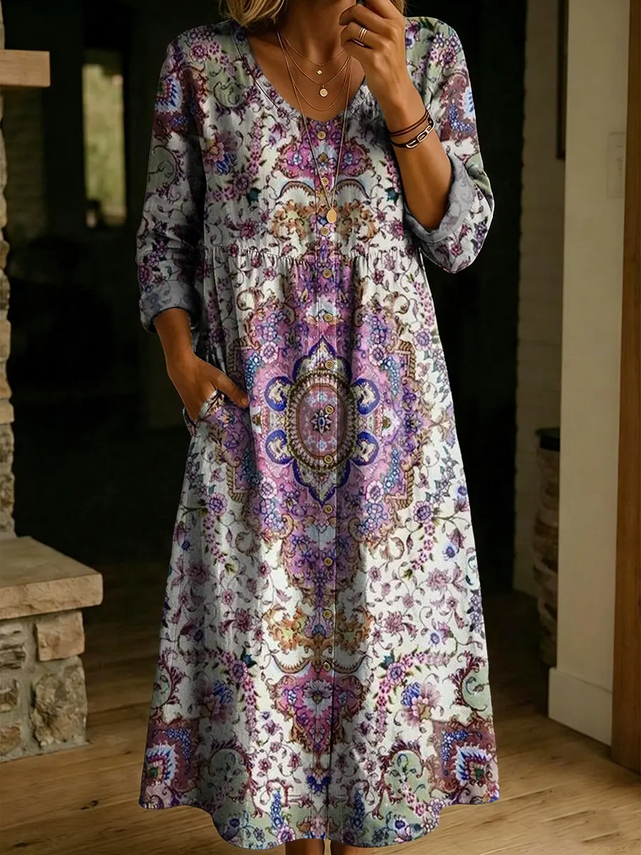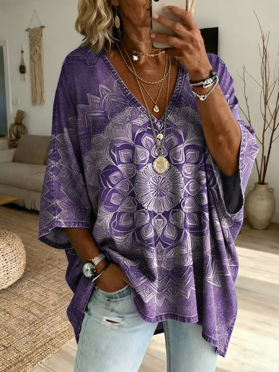Women's Retro Ethnic Floral Art Print Casual Long-sleeve V-neck Shirt