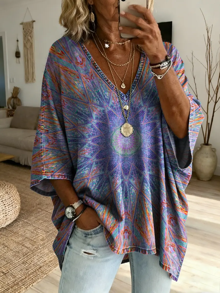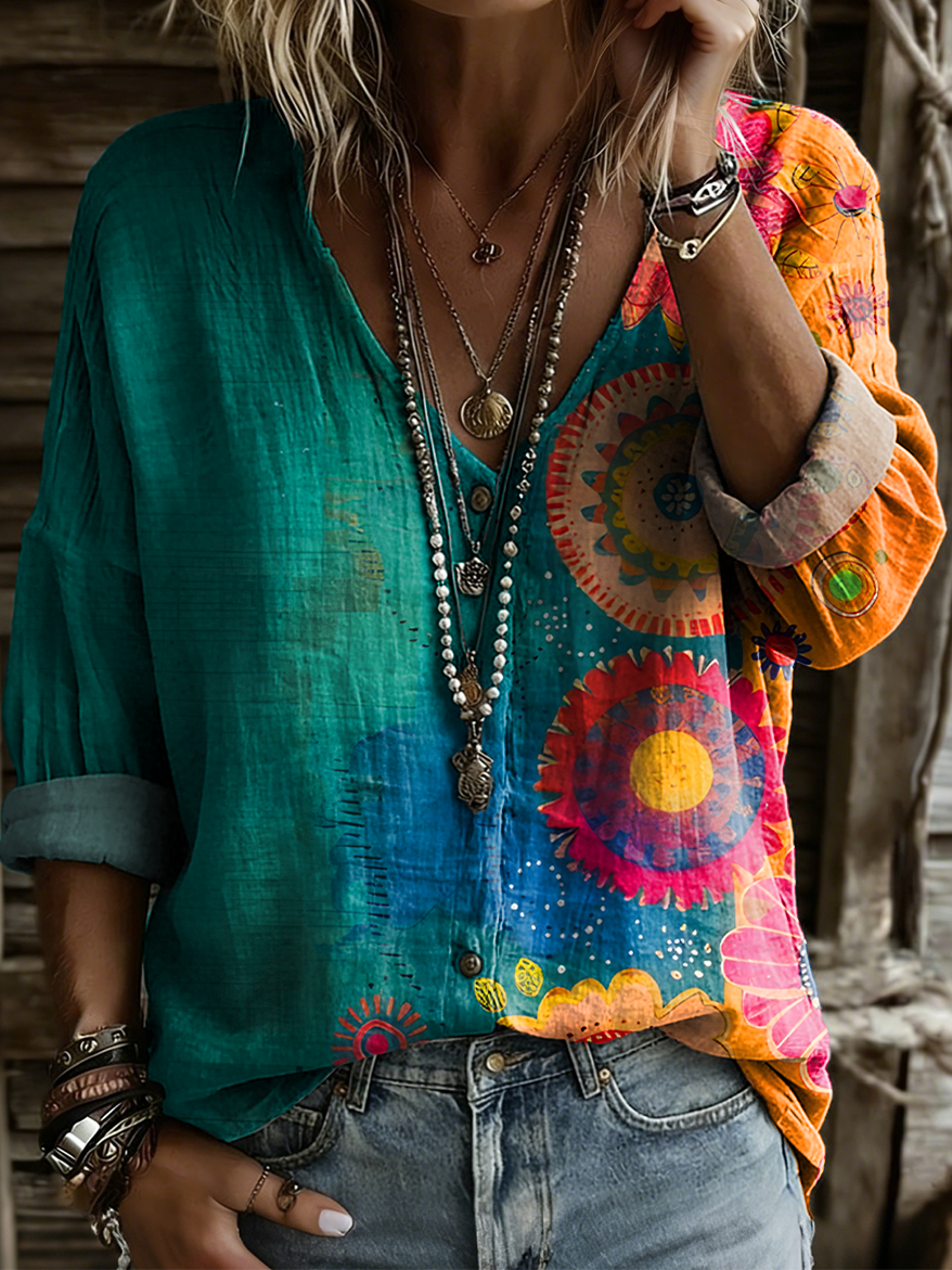 Women's Retro Colorful Art Print Casual Long-sleeve V-neck Shirt