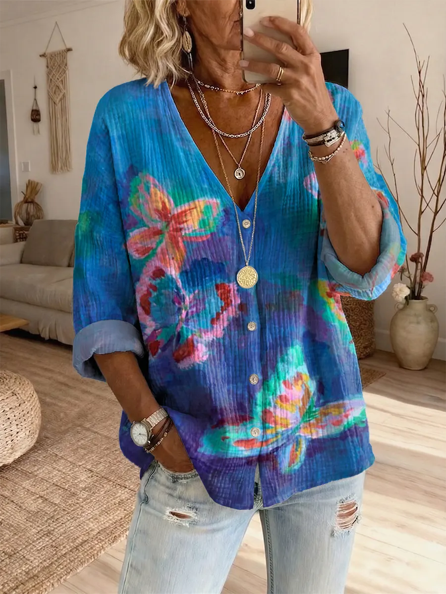 Women's Retro Hippie Tie-Dye Butterfly Art Print Casual Linen V-Neck Shirt