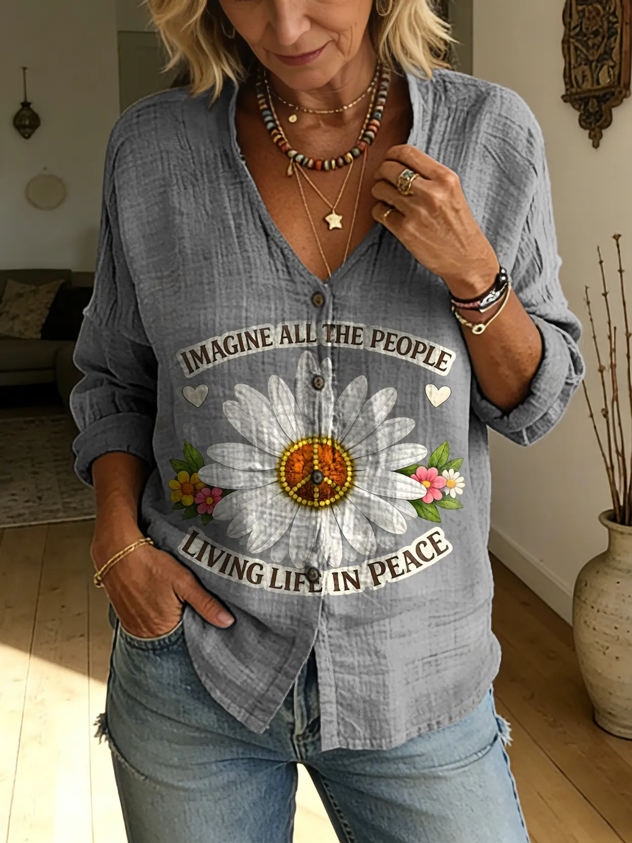 Women's Bohemian Hippie Sunflower Art Print Casual Linen V-Neck Shirt