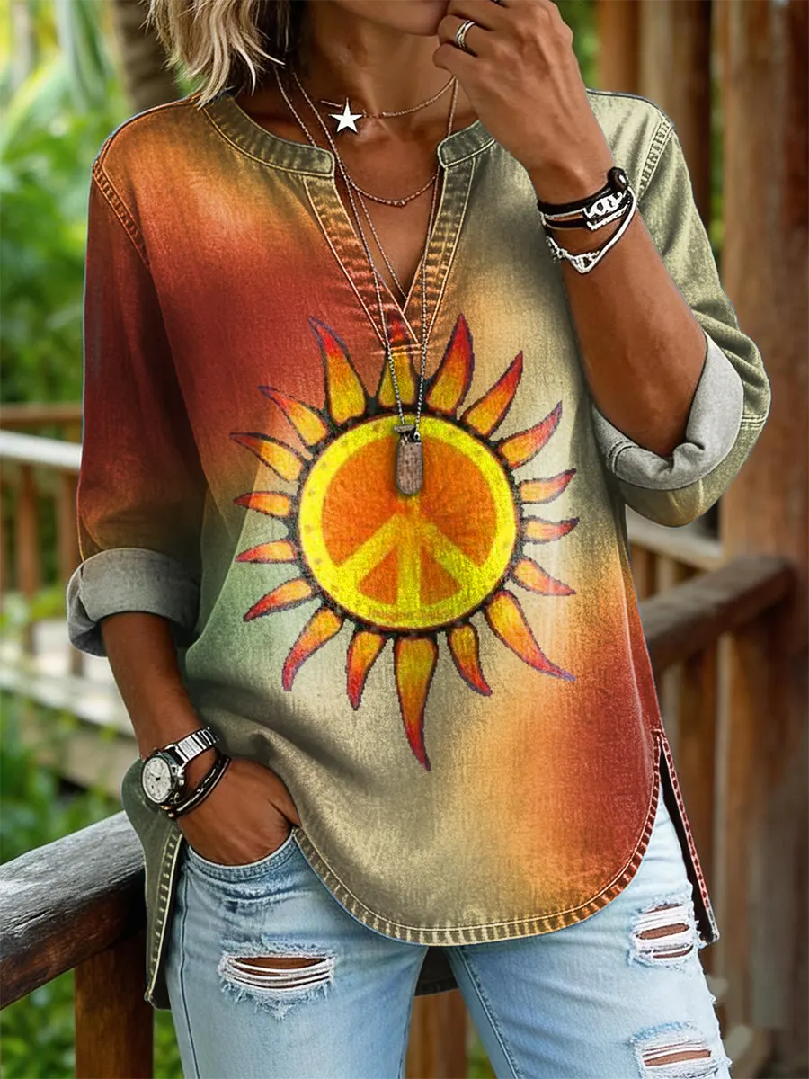 Women's Retro Colorful Sun Art Print Casual Long Sleeve V-neck Shirt