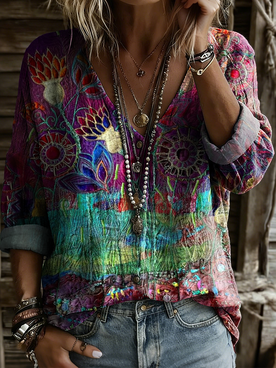 Women's Retro Colorful Ethnic Floral Art Print Casual Long-sleeve V-neck Shirt