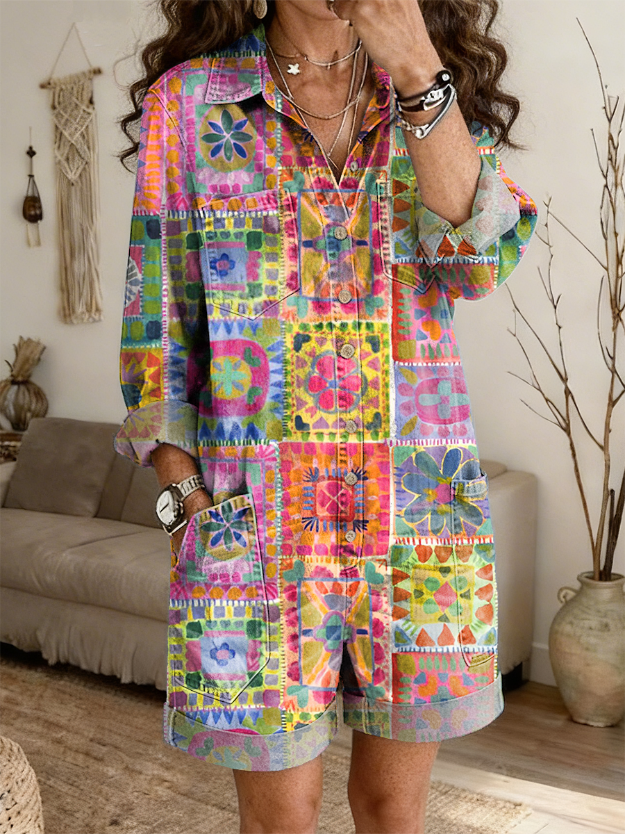 Women's Retro Colorful Ethnic Plaid Art Print Casual Long-sleeved Jumpsuit Shorts