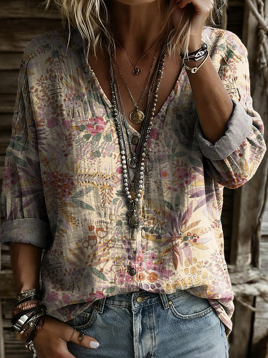 Women's Vintage Colorful Watercolor Floral Art Print Casual Linen V-Neck Shirt