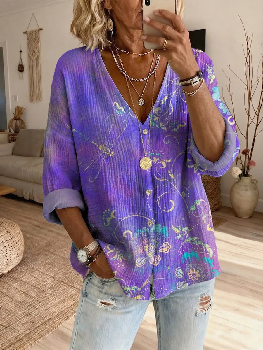 Women's Retro Floral And Butterfly Art Print Casual Long-sleeve V-neck Shirt