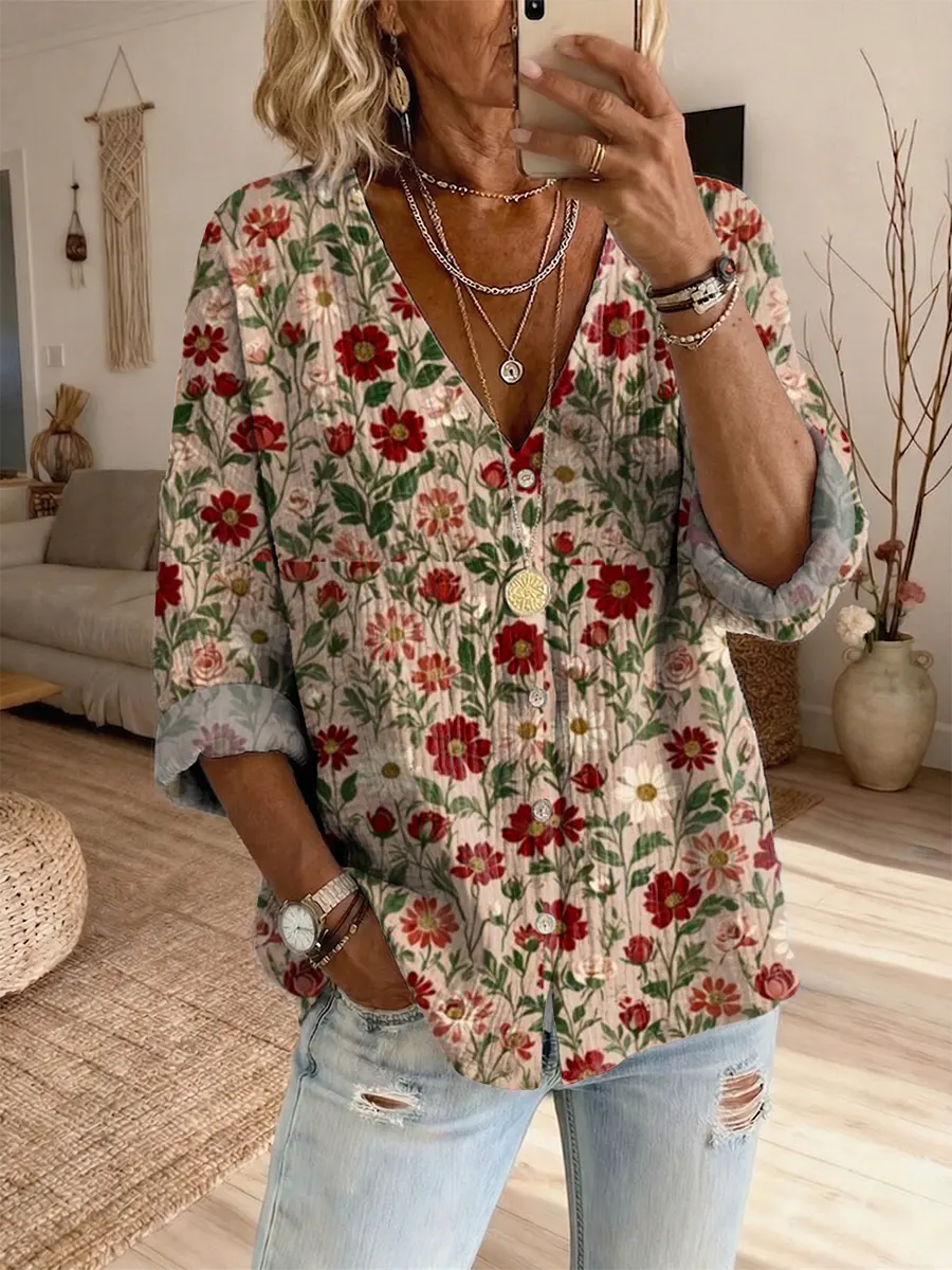 Women's Retro Floral Art Print Casual Long-sleeve V-neck Shirt