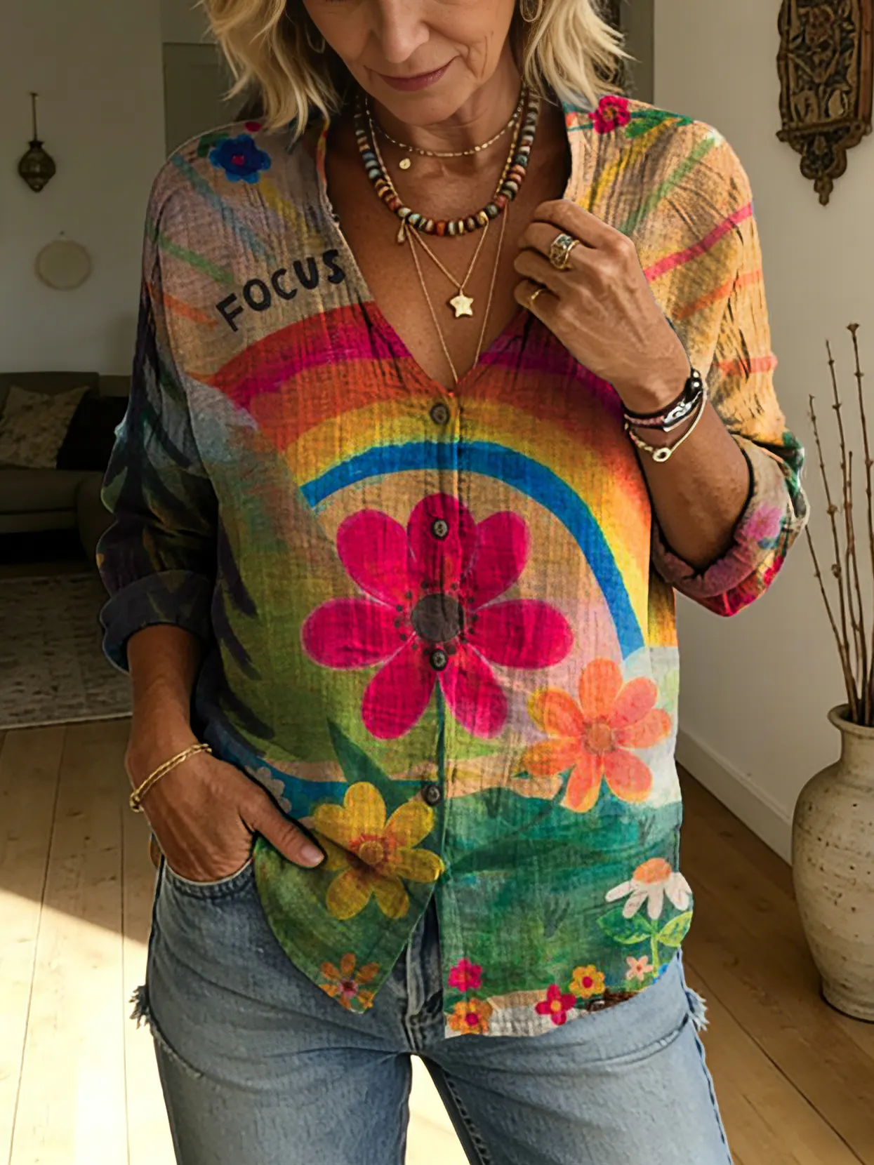 Women's Colorful Hippie Floral Art Print Casual Long-sleeve V-neck Shirt