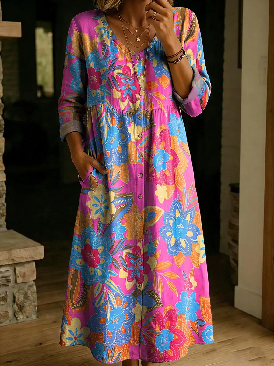 Women's Retro Colorful Floral Art Print Casual Long-sleeve V-neck Shirt