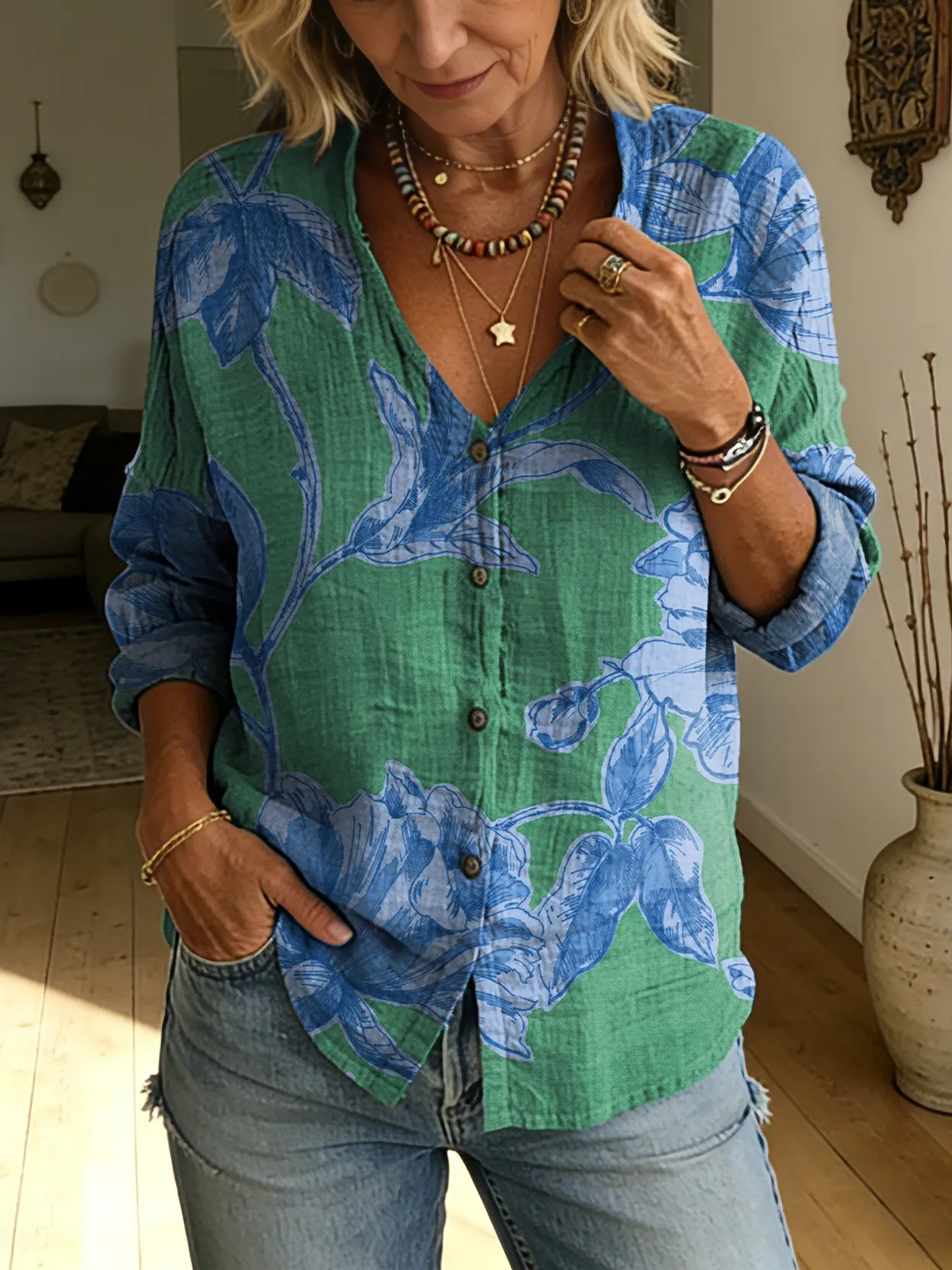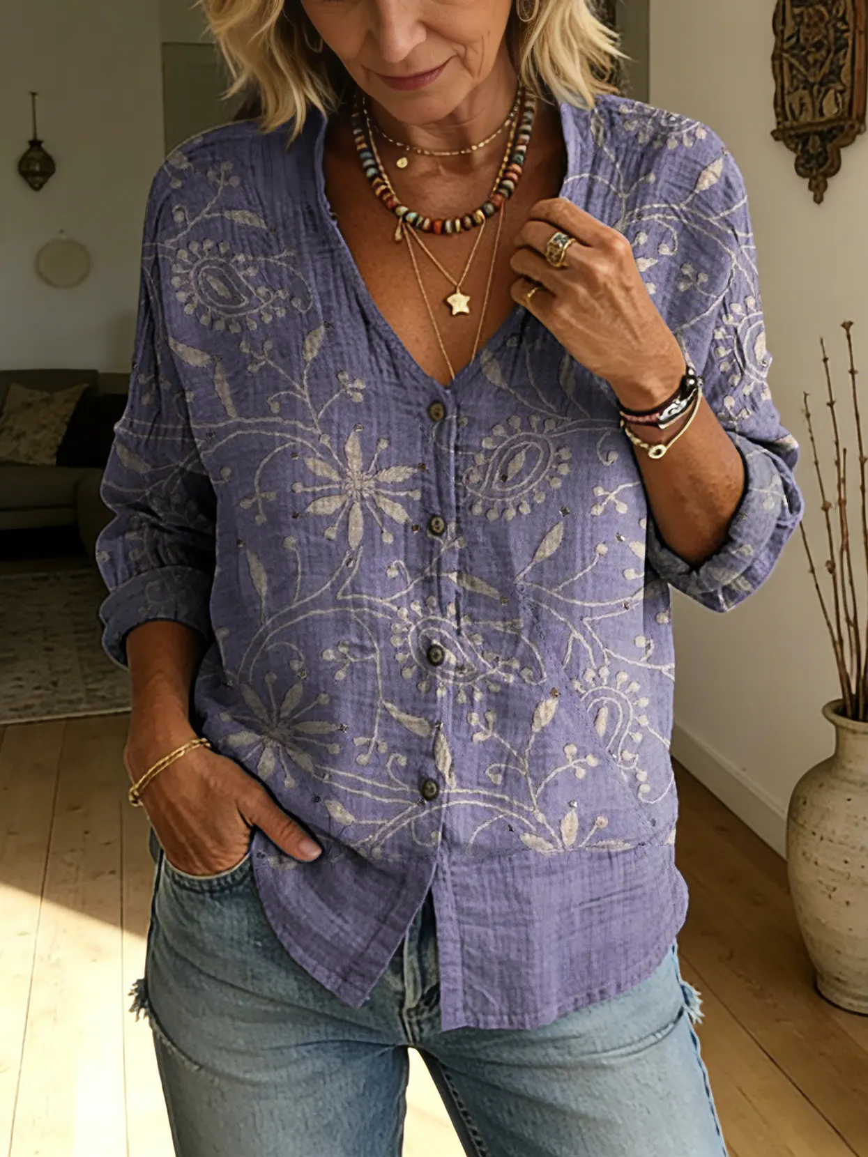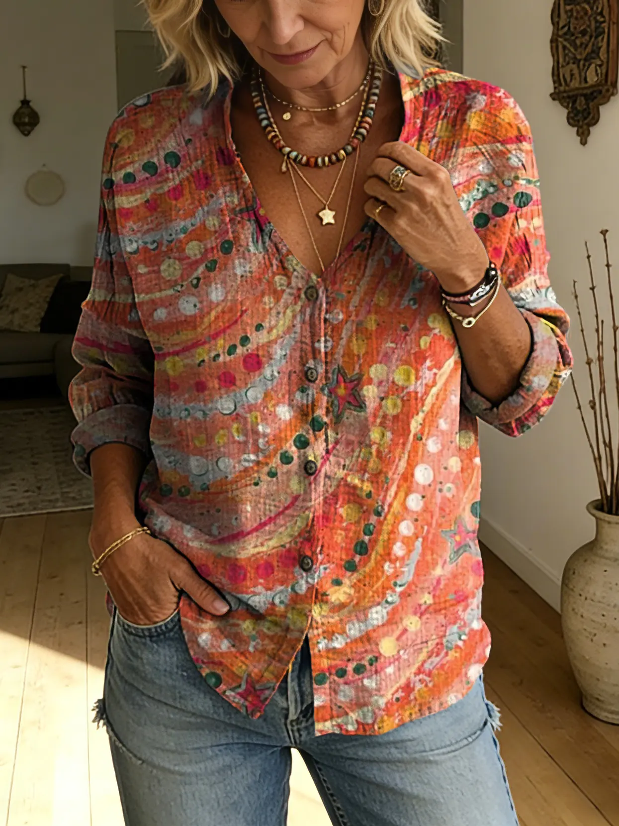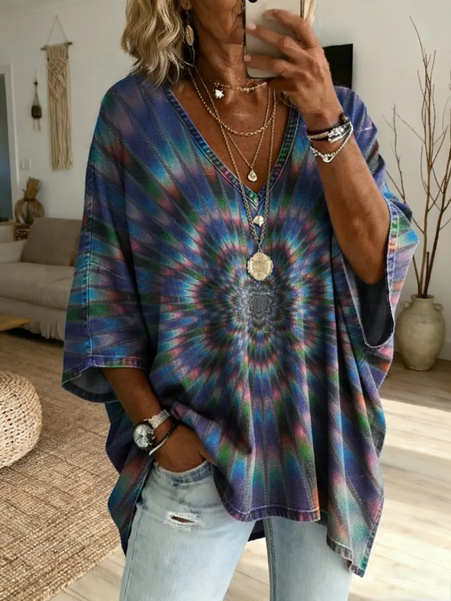 Women's Retro Tie-dye Art Print Casual Long-sleeve V-neck Shirt