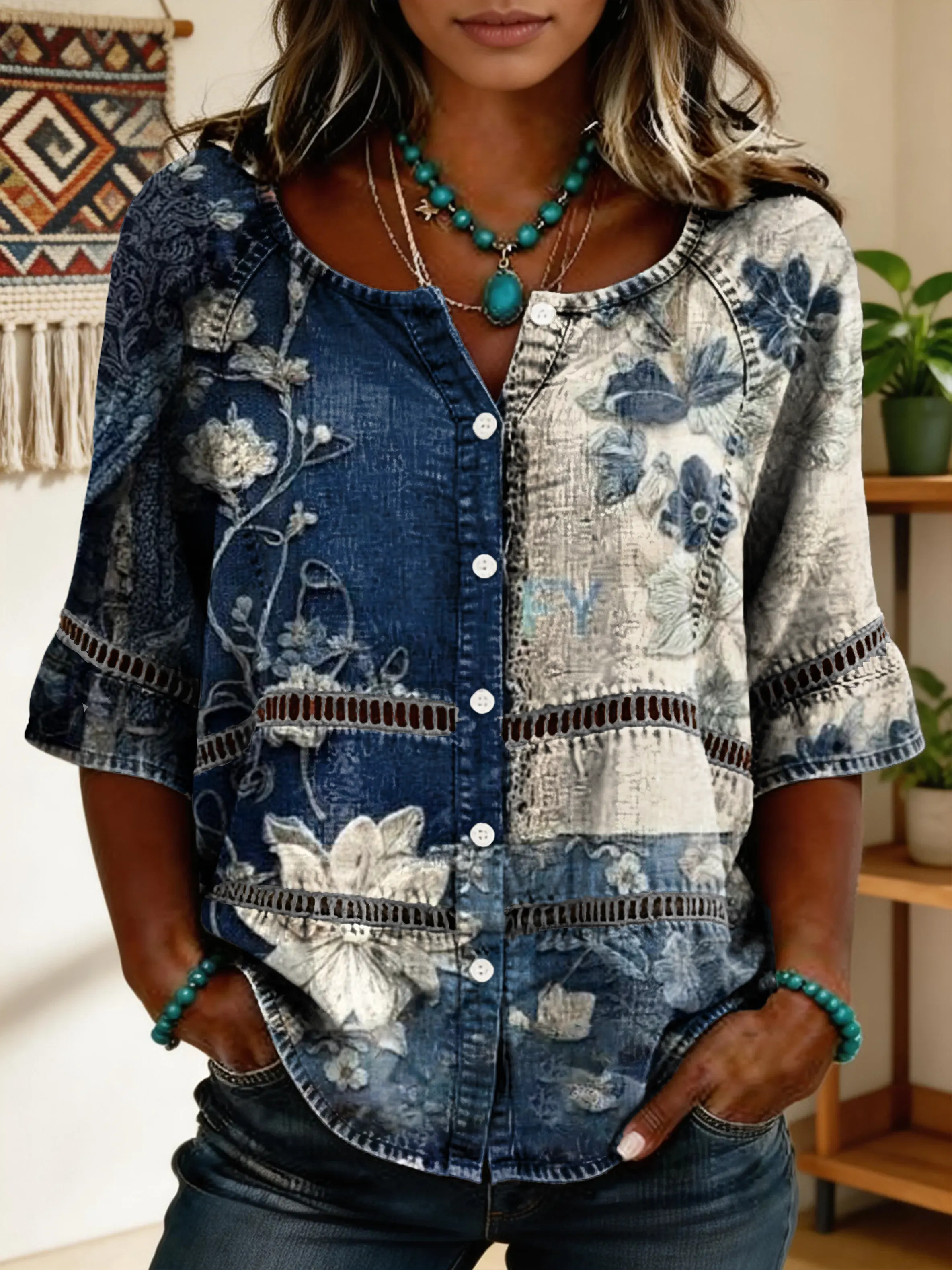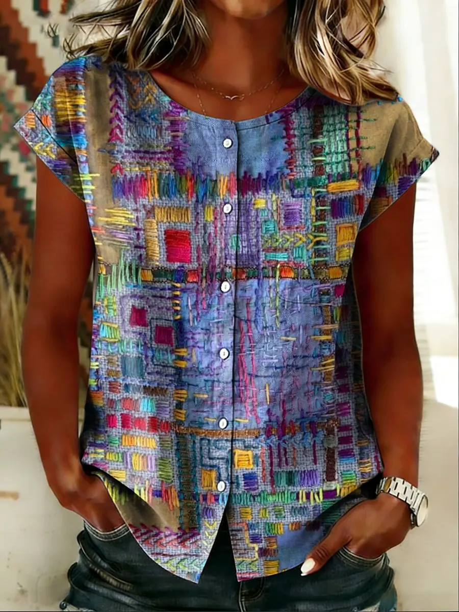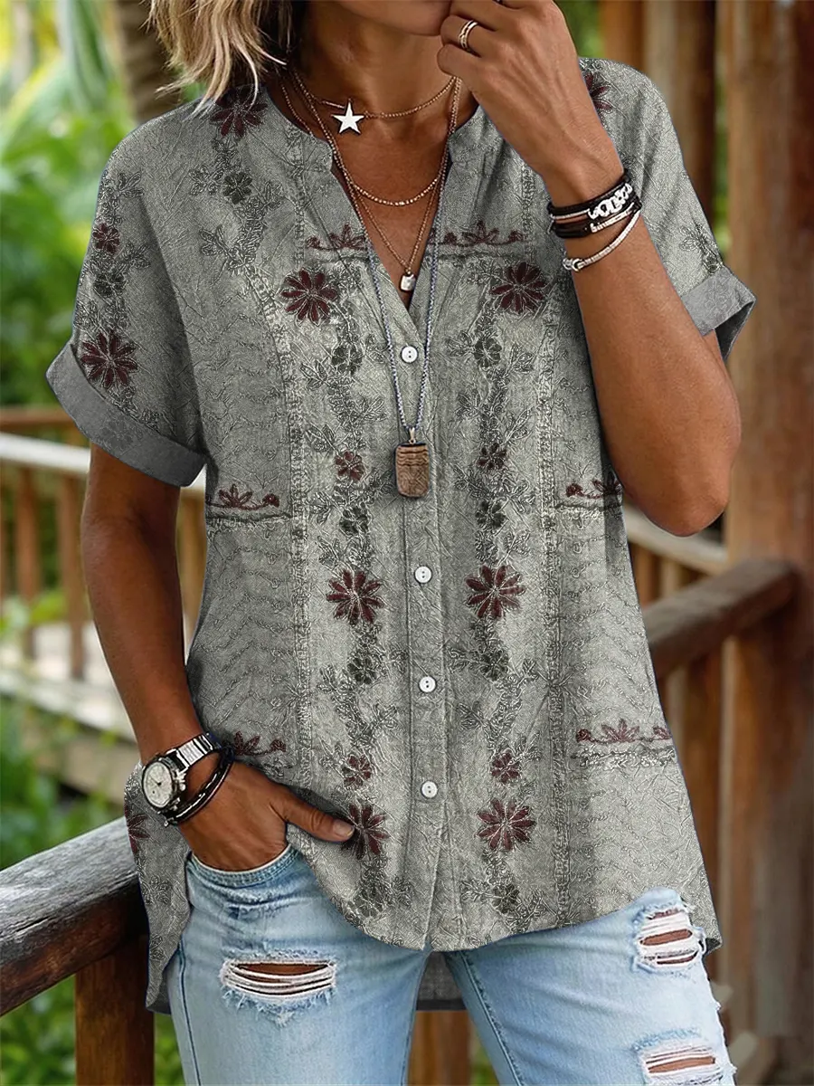 Women's Short-sleeve Cotton-linen Blouse With Floral Patchwork Artistic Print And Cutout Details