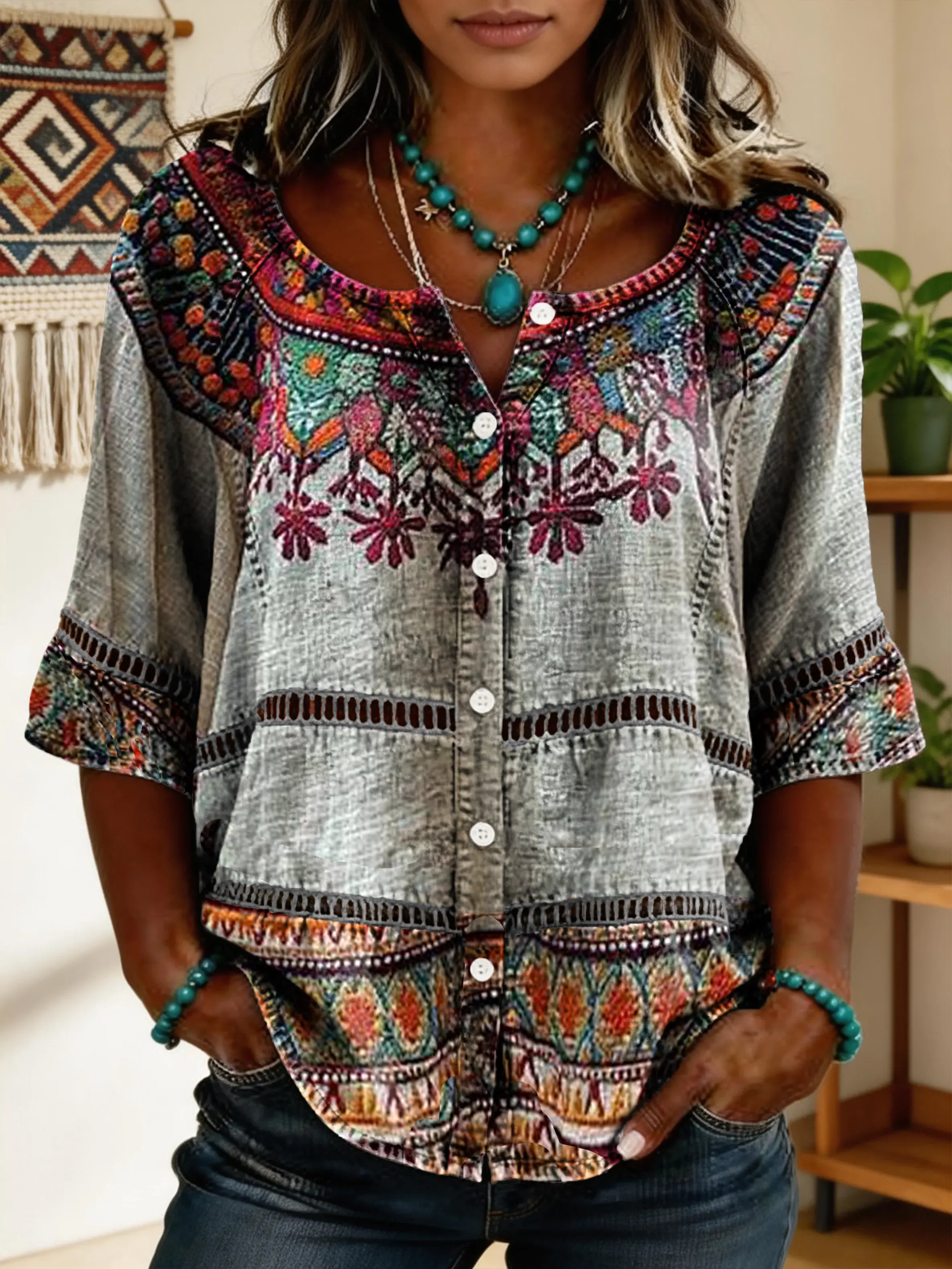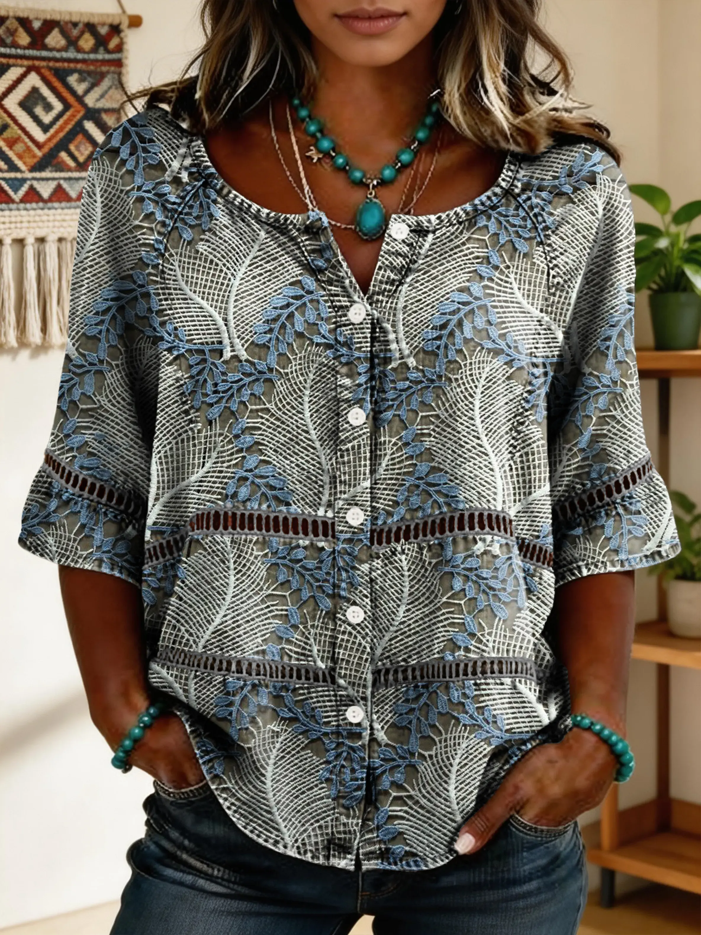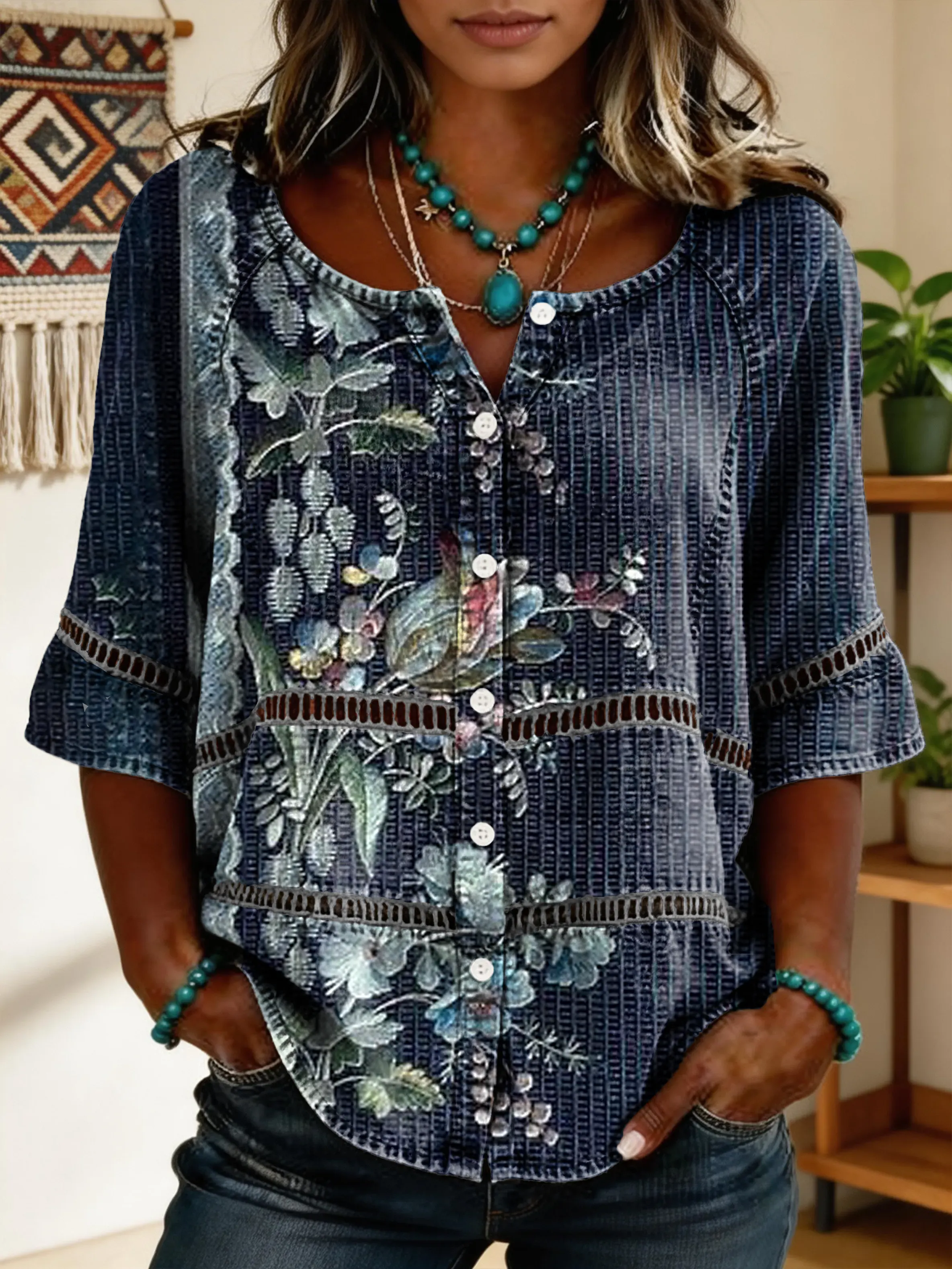 Women's Short-sleeve Cotton-linen Blouse With Floral Patchwork Artistic Print And Cutout Details
