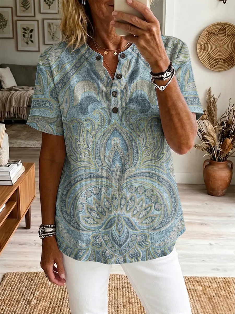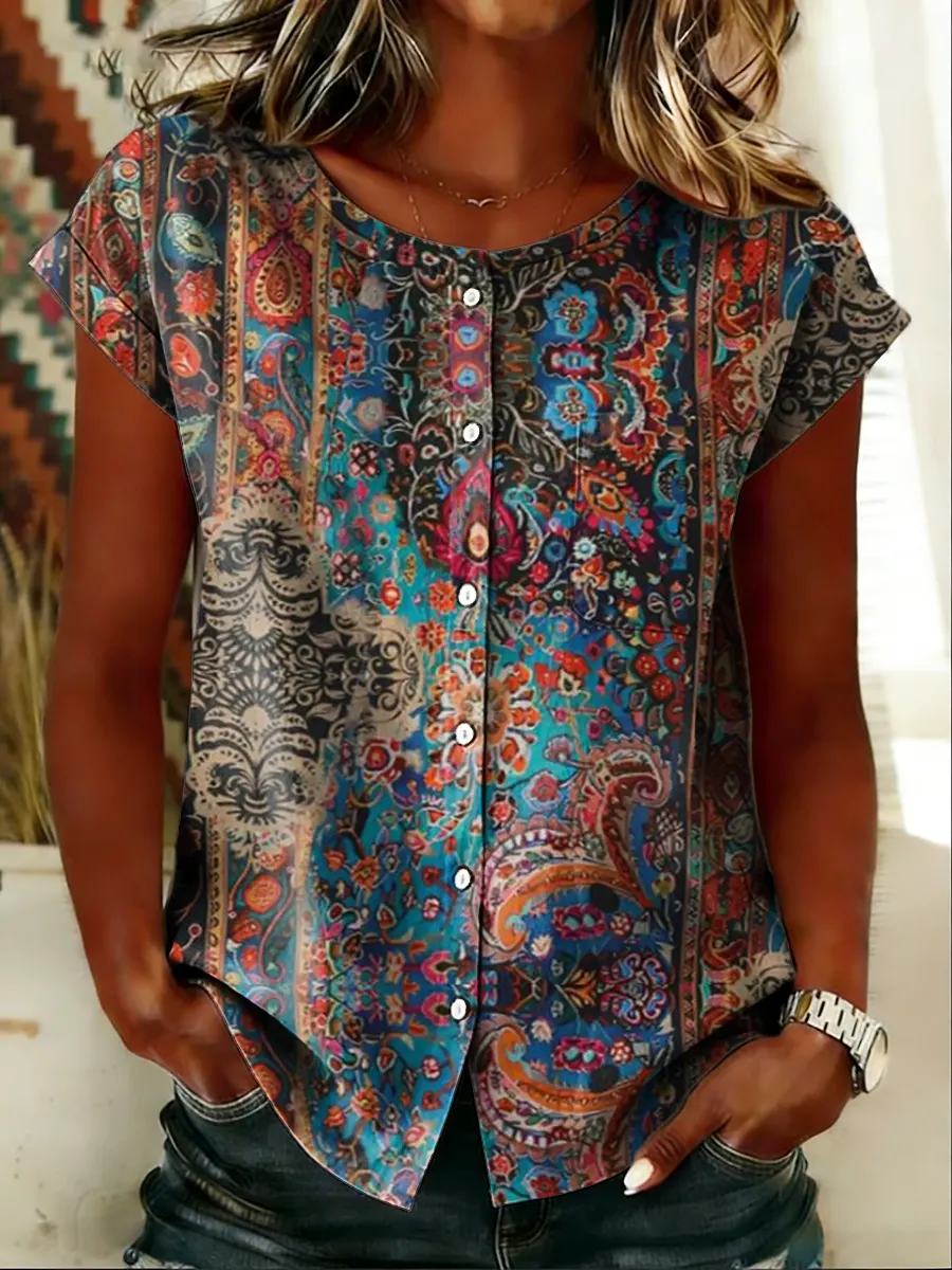 Ethnicity Paisley Flowers Women's Art Print Casual Short-sleeve 100%cotton Shirt