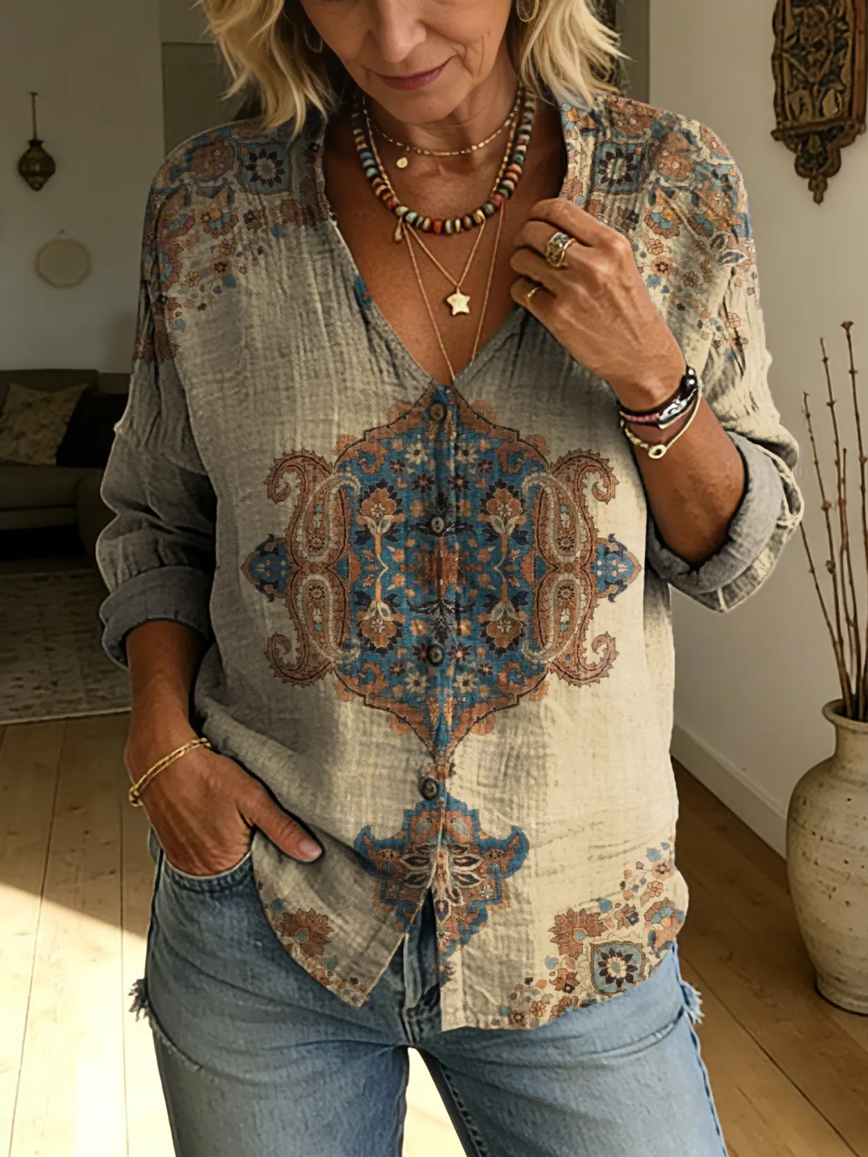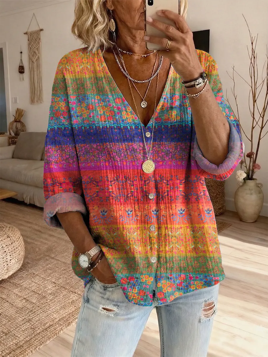 Women's Retro Colorful Ethnic Plaid Art Print Casual Long-sleeve V-neck Shirt