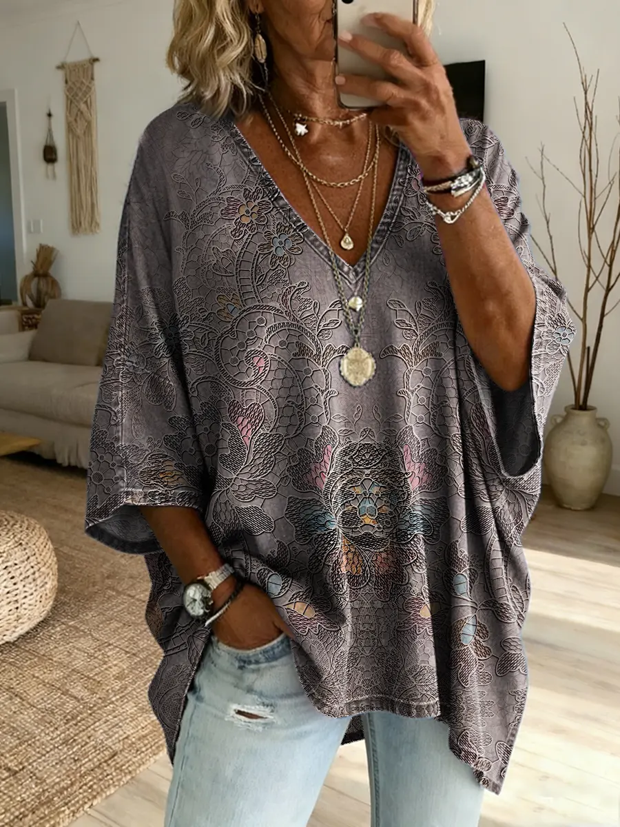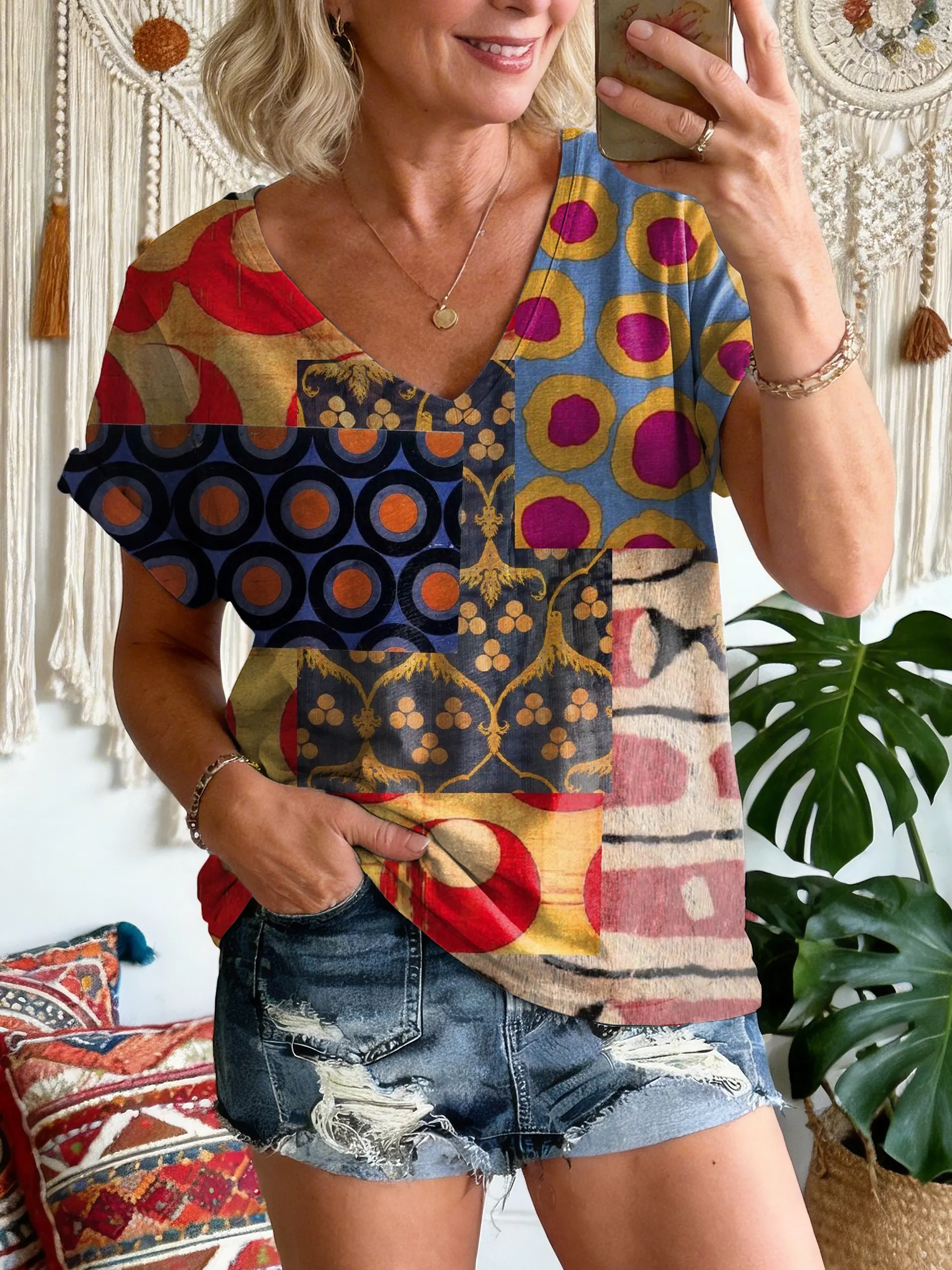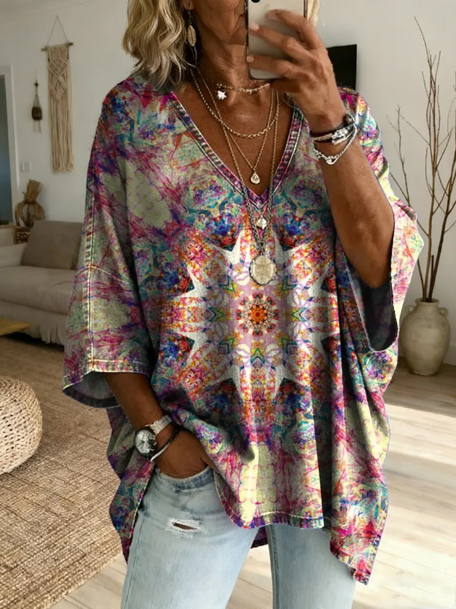 Women's Short-sleeve V-neck Top With Abstract Bohemian-inspired Artistic Print