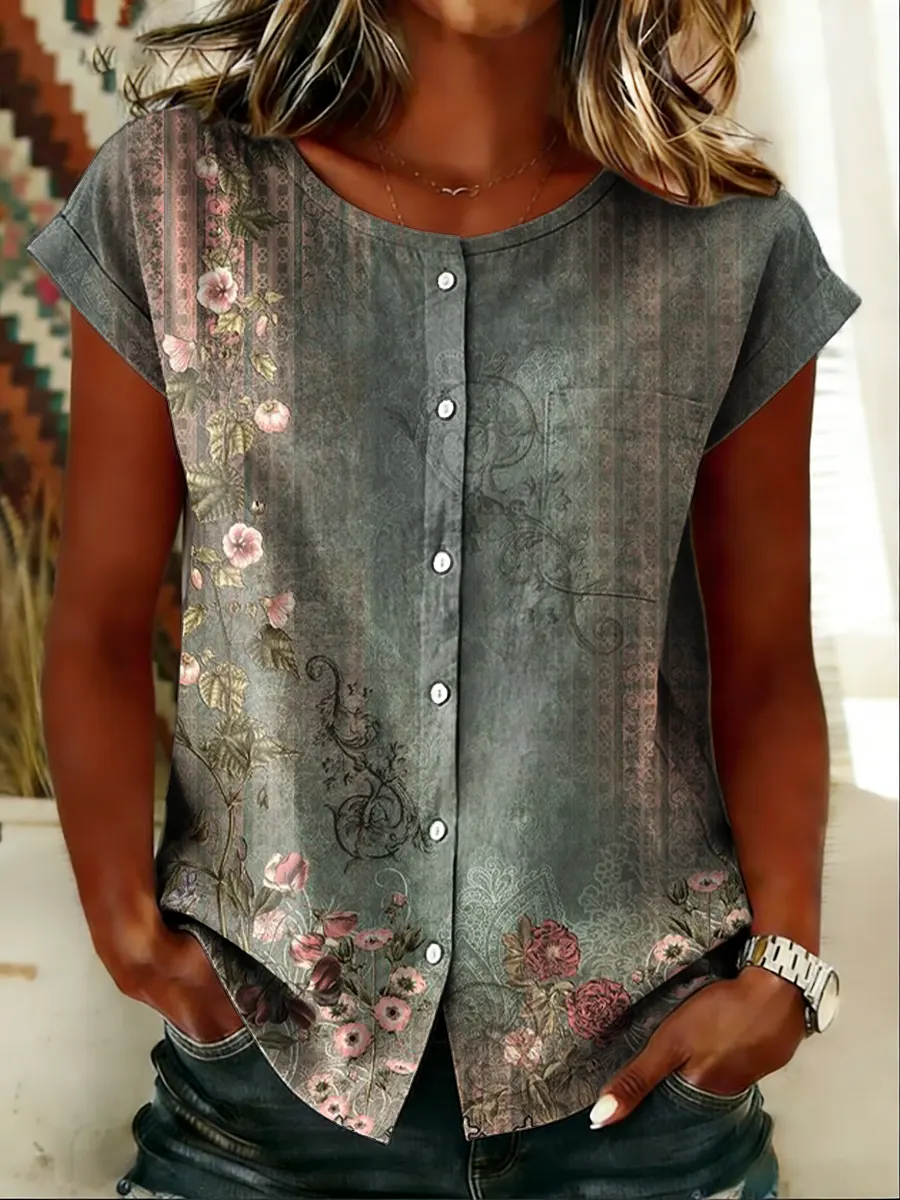 Women's Retro Floral Art Print Casual Short-sleeve Crew Neck T-shirt