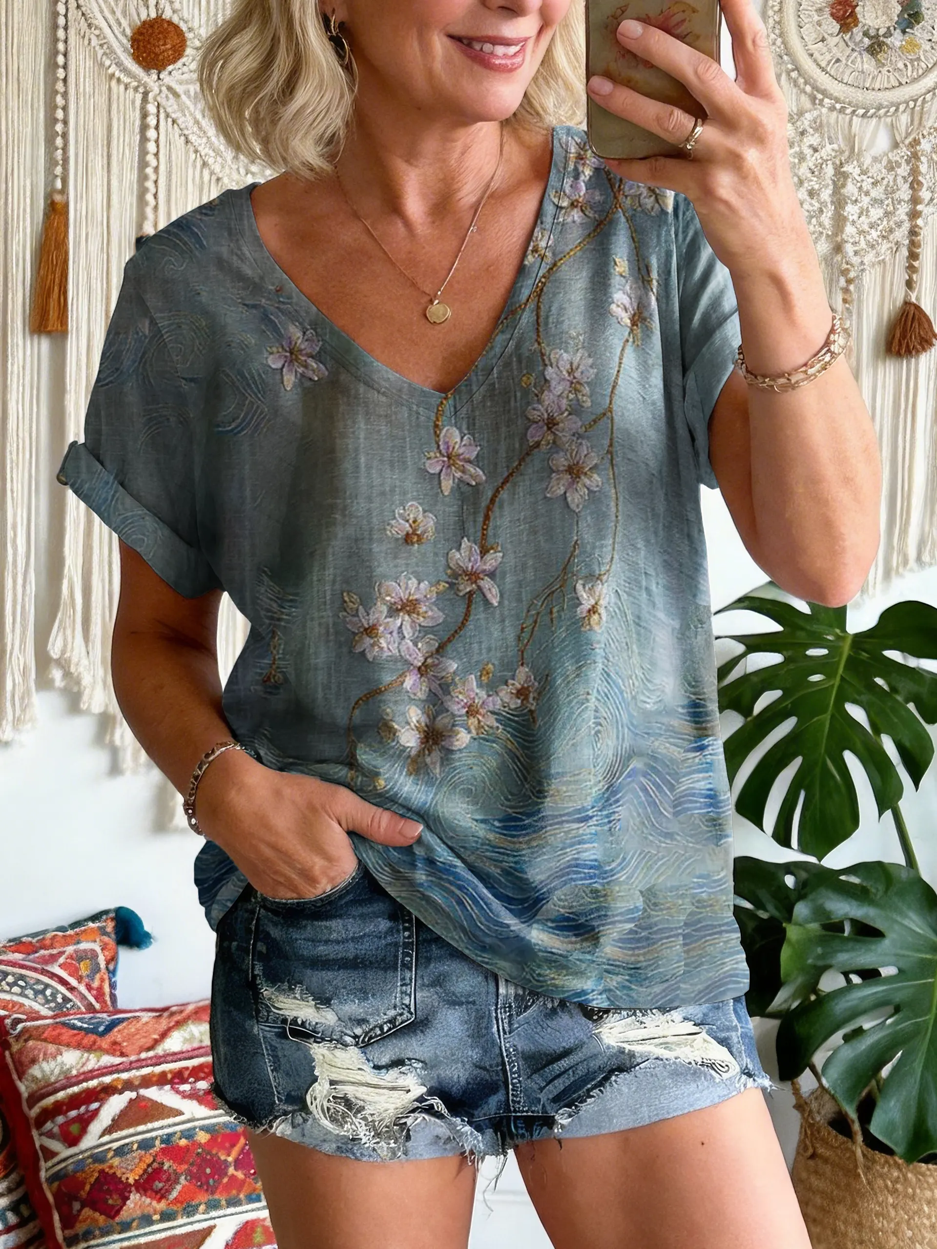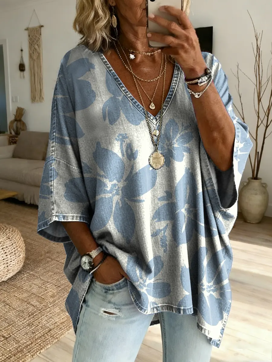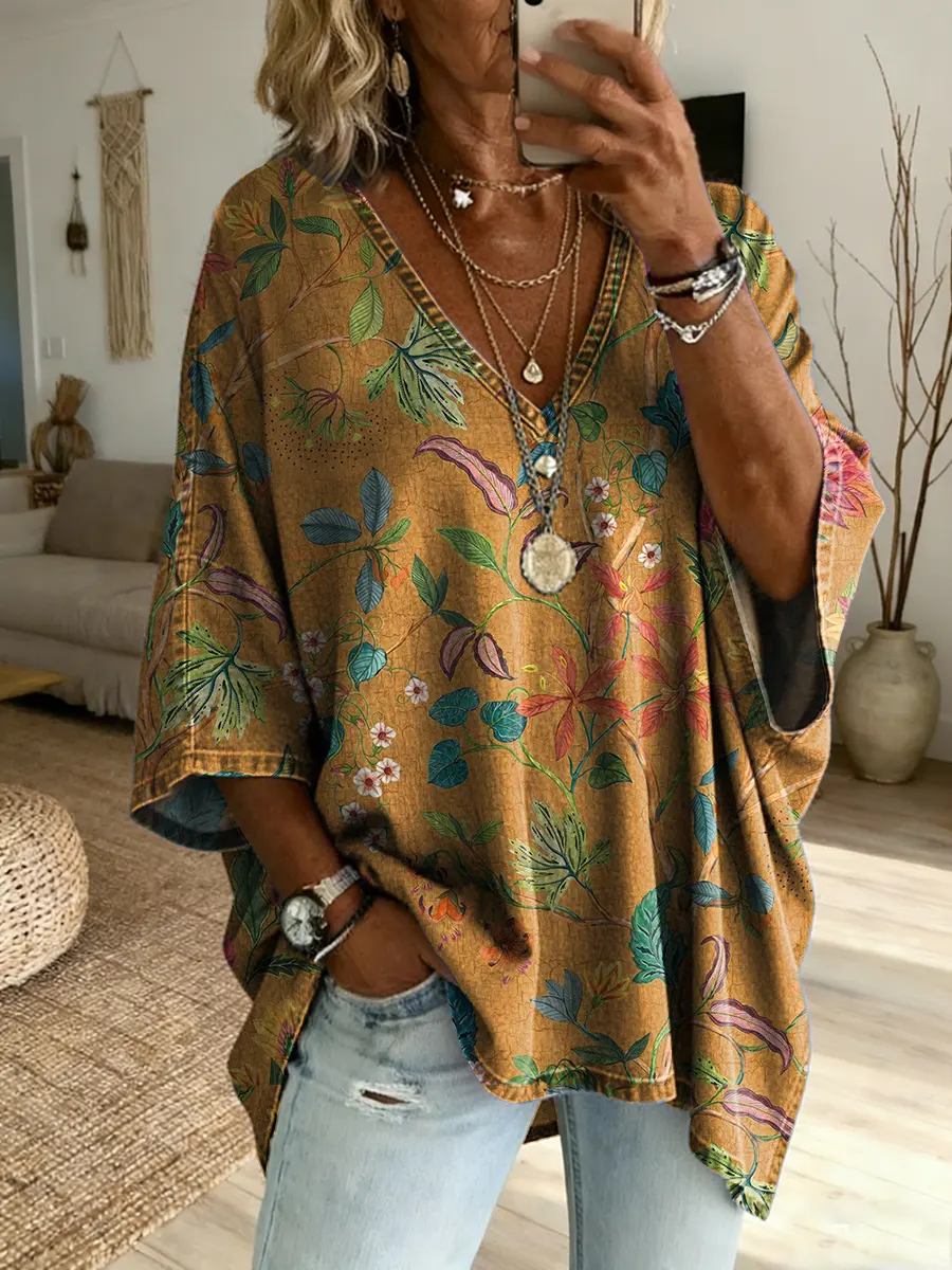 Women's Vintage Floral Pattern Art Print V-neck Short Sleeve