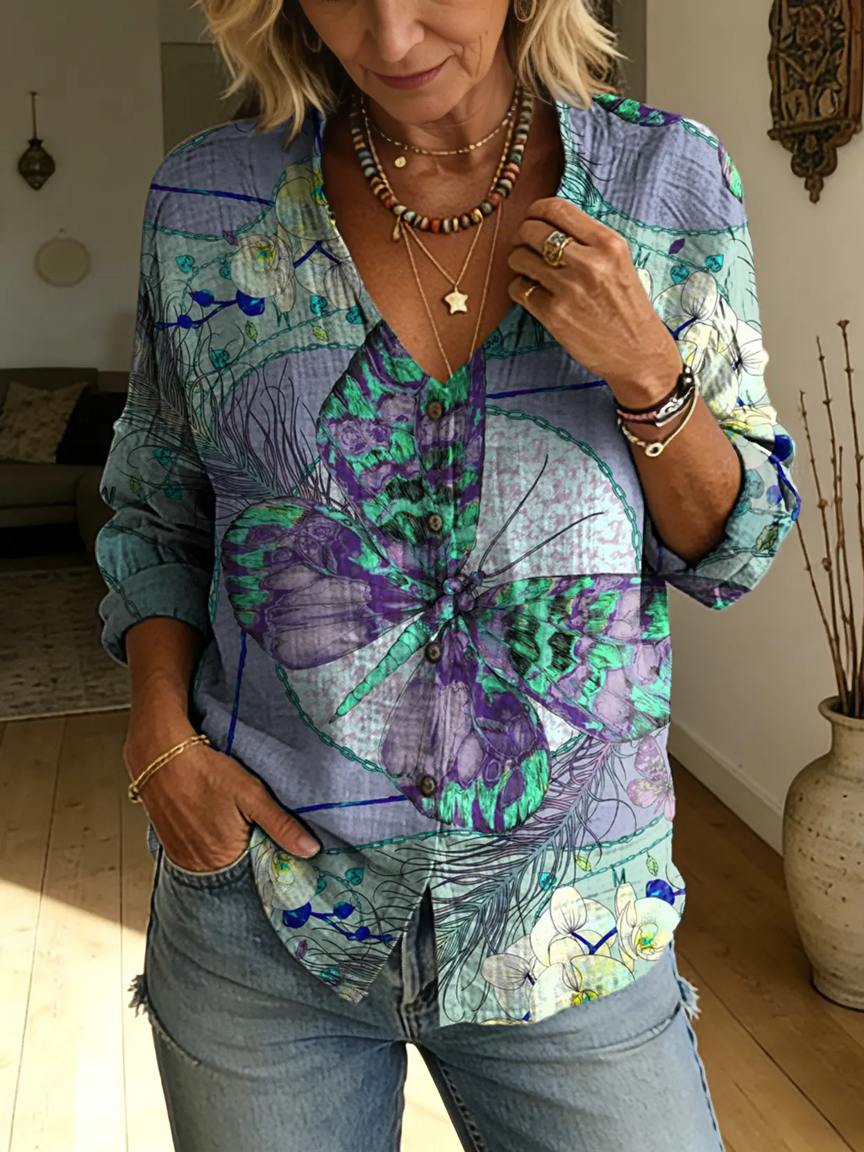 Women's Short-sleeve Shirt With Artistic Butterfly Print And Openwork Buttons