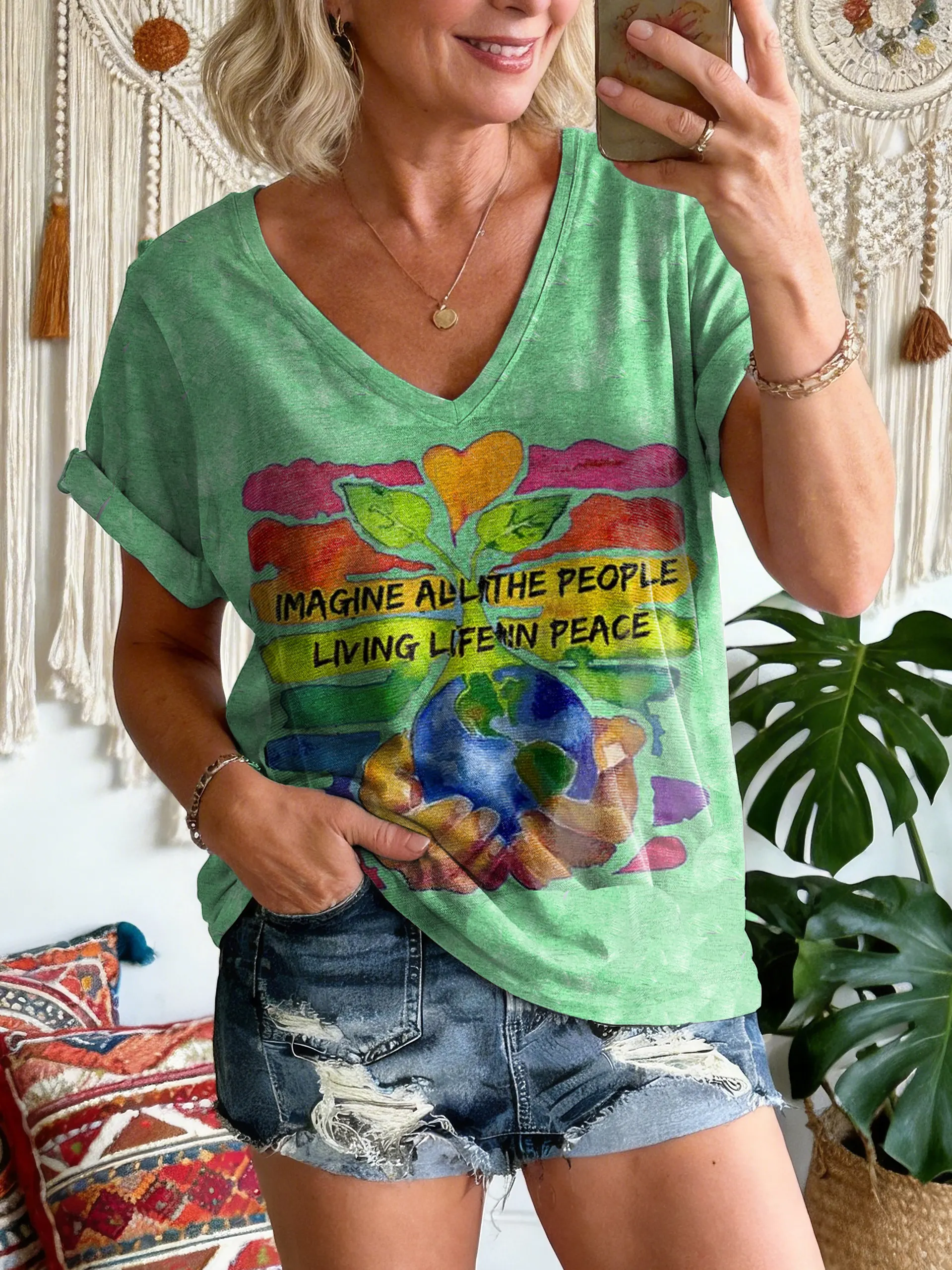 Women's “imagine We Live In Peace” Artistic Print V-neck Short-sleeve Top