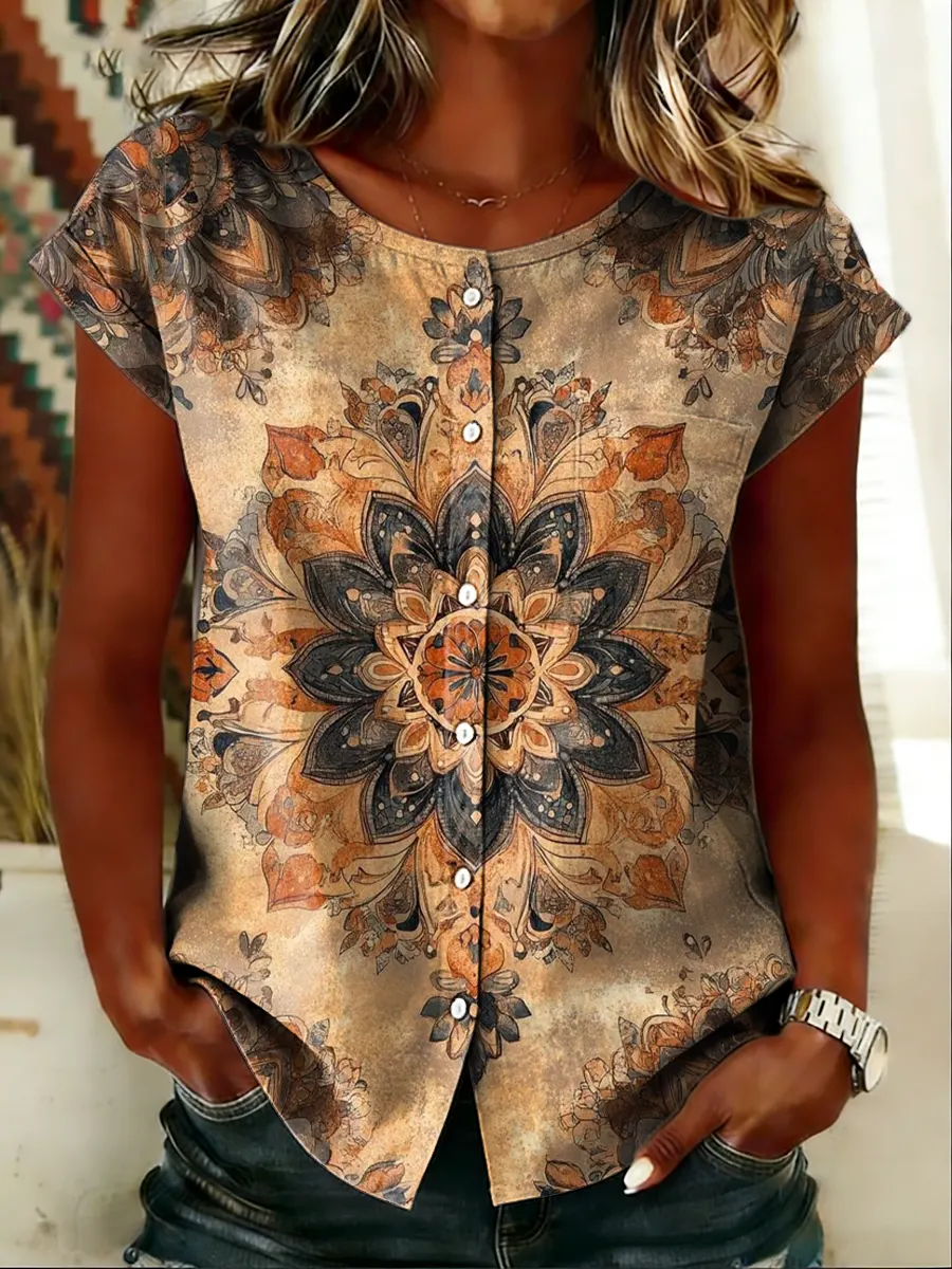Women's Retro Ethnic Floral Art Print Casual Short-sleeve Crew Neck T-shirt