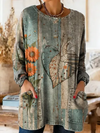 Bohemian Vintage Heart-shaped Art Print Casual Washed Denim Cotton Top
