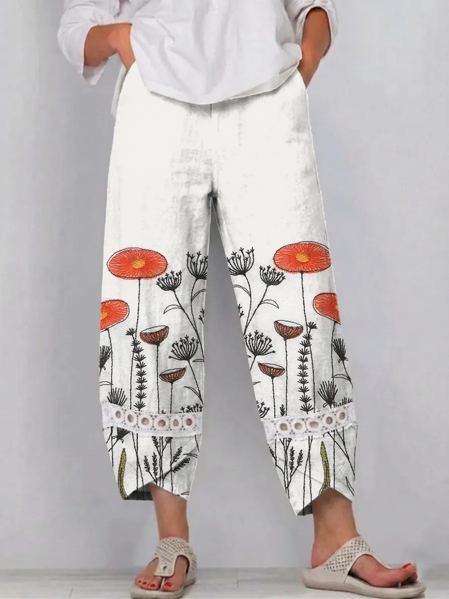 Ethnic Bohemia Flowers Women's Art Print Casual Cotton Cutout Pants