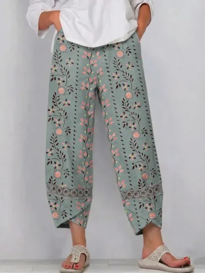Ethnic Style Flowers Women's Art Print Casual Cotton Cutout Pants