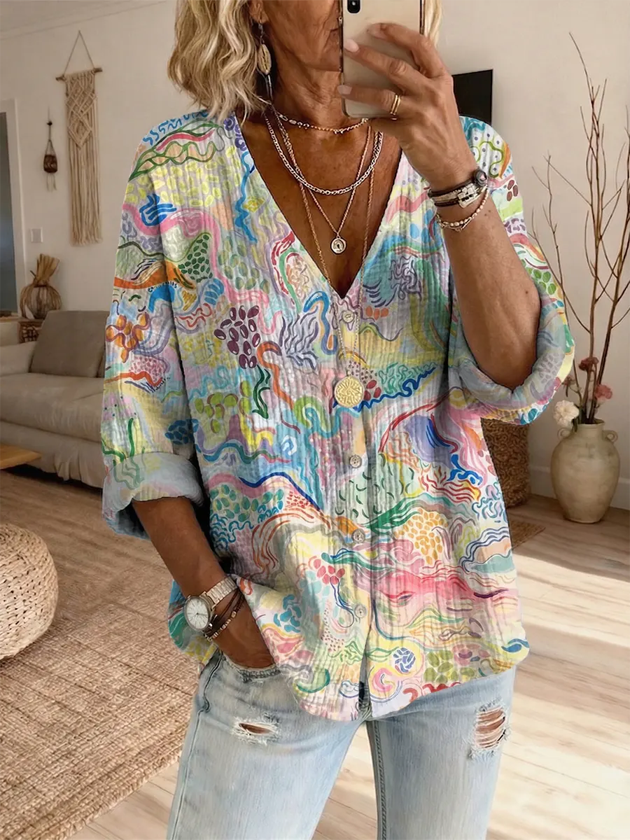 Ethnicity Colorful Doodle Geometry Women's Art Print Casual Long-sleeve V-neck Shirt