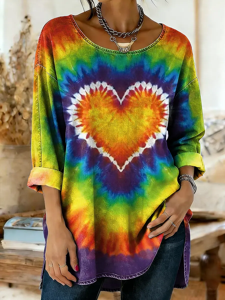 Ethnicity Colorful Love Tie Dye Women's Art Print Casual Round Neck Washed Denim Cotton Top