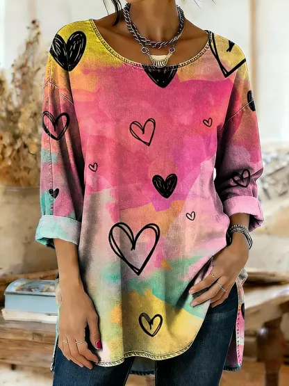 Ethnicity Colorful Love Women's Art Print Casual Round Neck Washed Denim Cotton Top