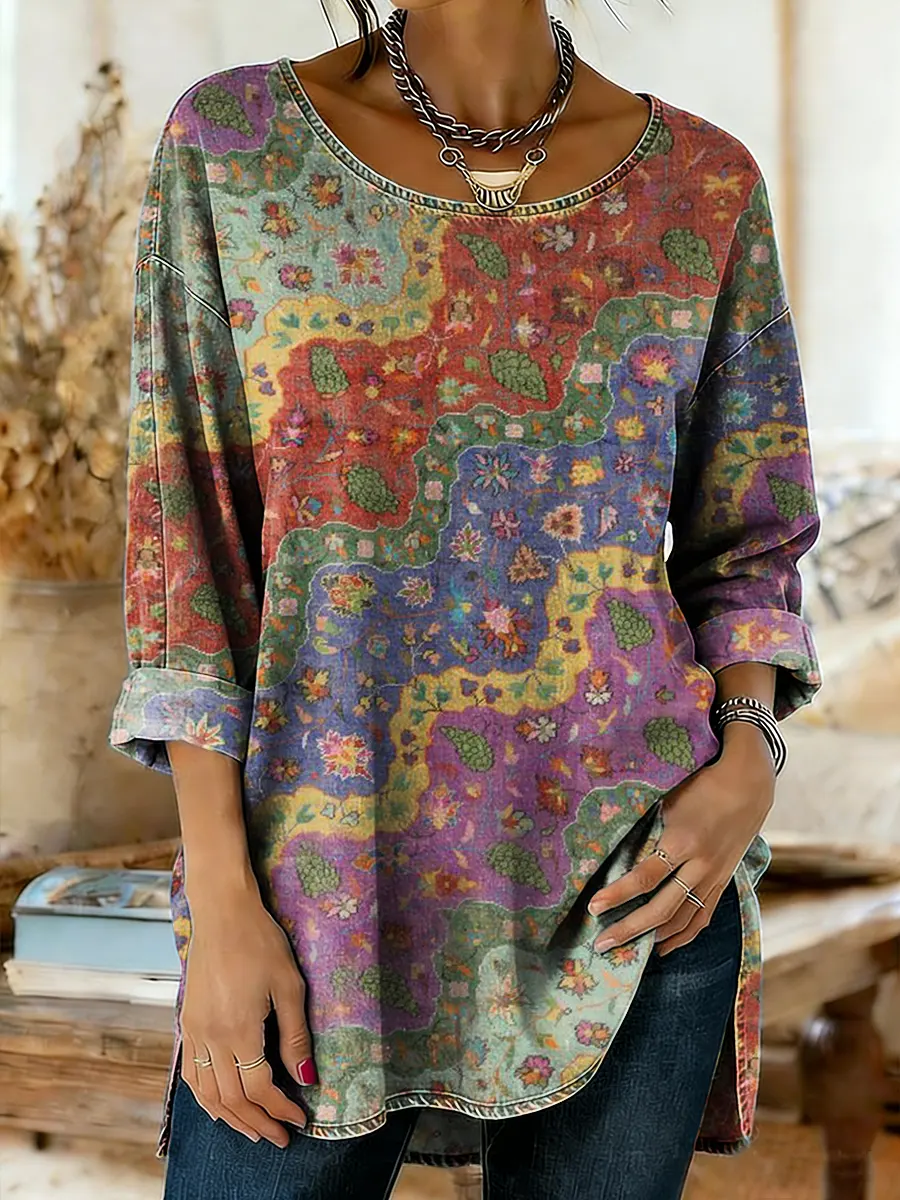 Ethnicity Flowers Arc Women's Art Print Casual Round Neck Washed Denim Cotton Top
