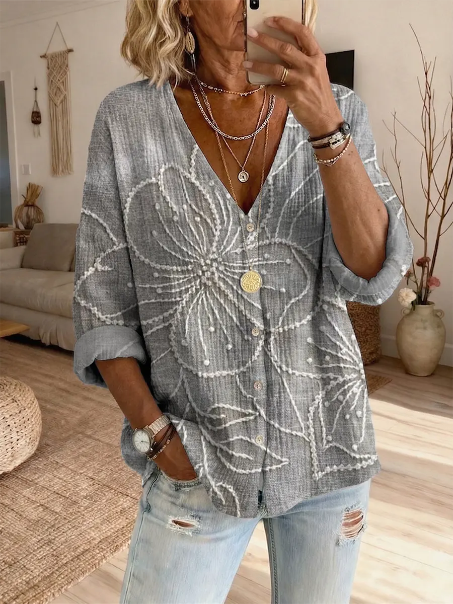 Ethnicity Flowers Geometry Women's Art Print Casual Long-sleeve V-neck Shirt