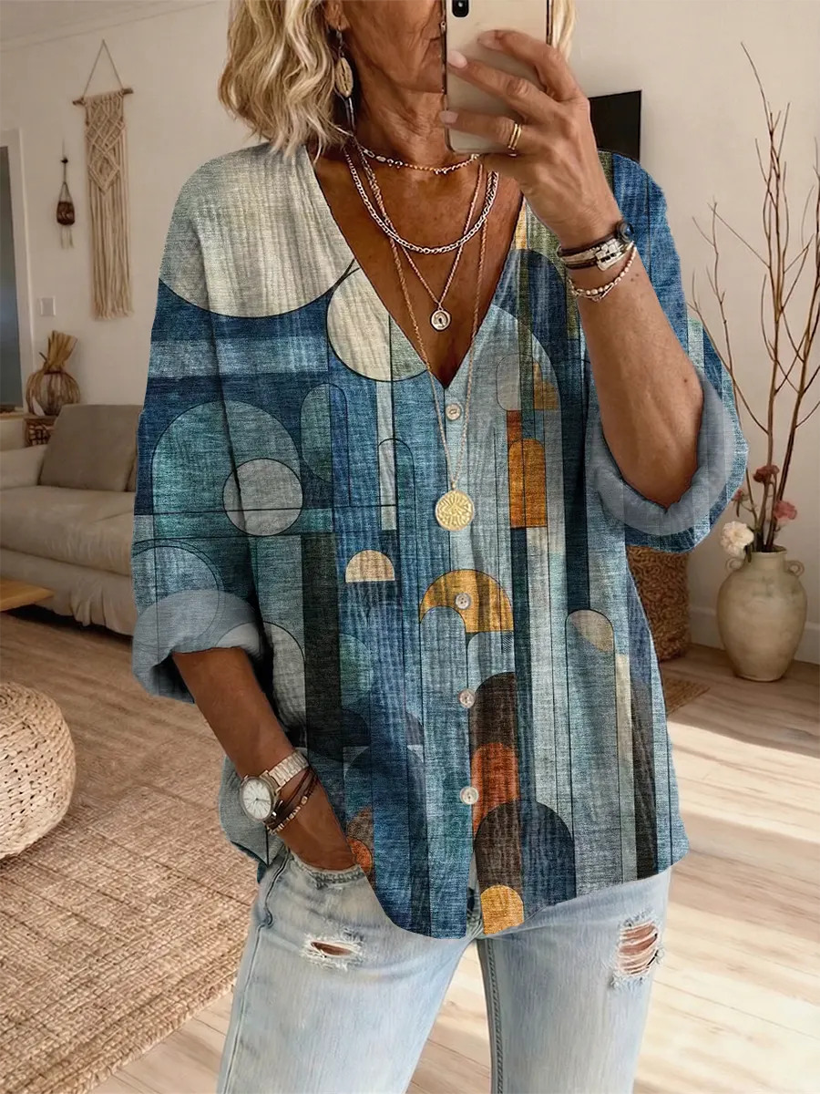 Ethnicity Geometry Color Blocks Women's Art Print Casual Long-sleeve V-neck Shirt
