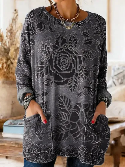 Ethnicity Geometry Texture Flowers Women's Casual Long-sleeve Crew Neck Pocket Washed Cotton Denim T-shirt