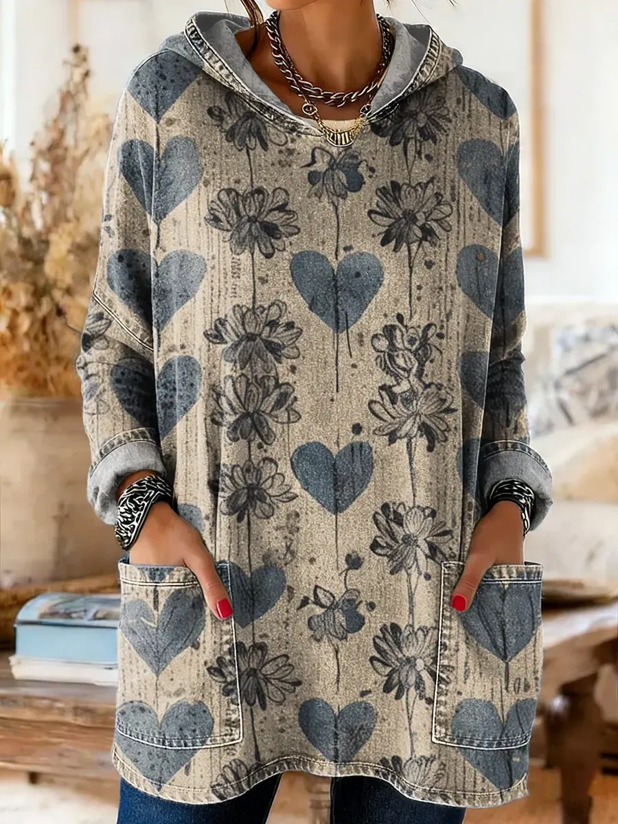 Ethnicity Retro Flowers Love Women's Casual Pocket Hooded Washed Cotton Denim T-shirt