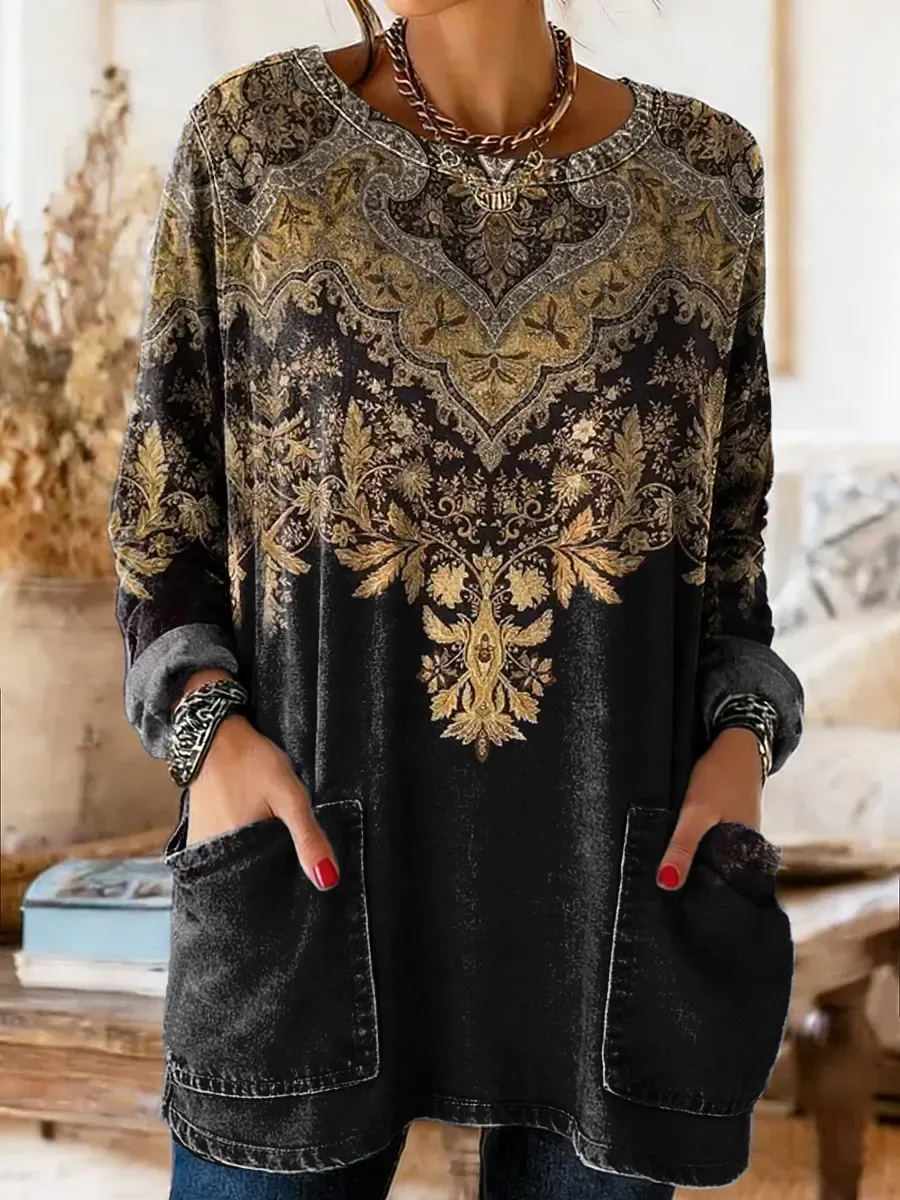 Ethnicity Retro Totem Geometry Women's Casual Long-sleeve Crew Neck Pocket Washed Cotton Denim T-shirt