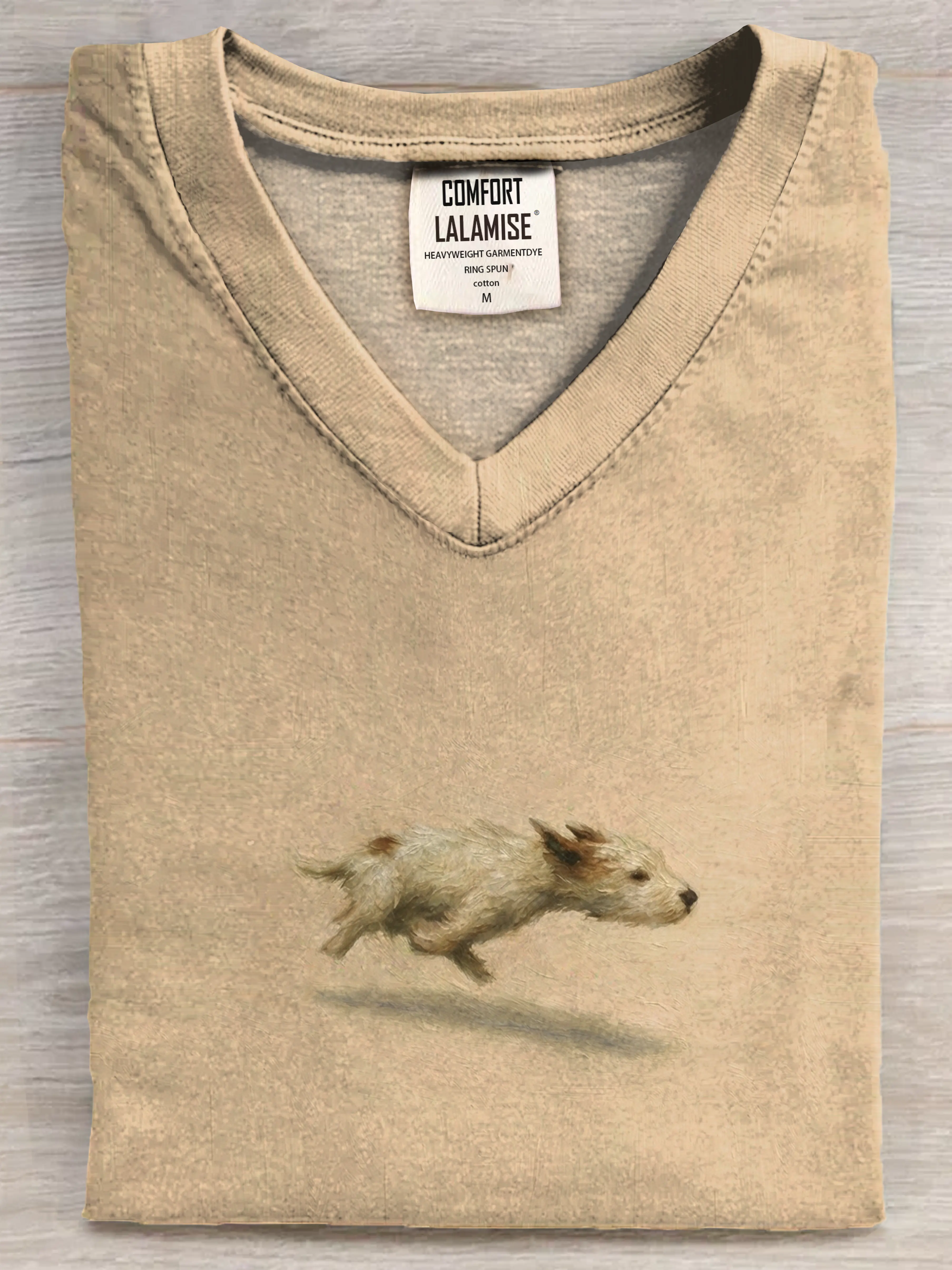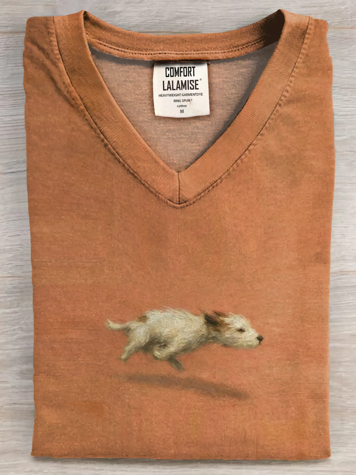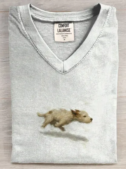 Funny Cute Running Dog Art Print V-neck Casual T-shirt