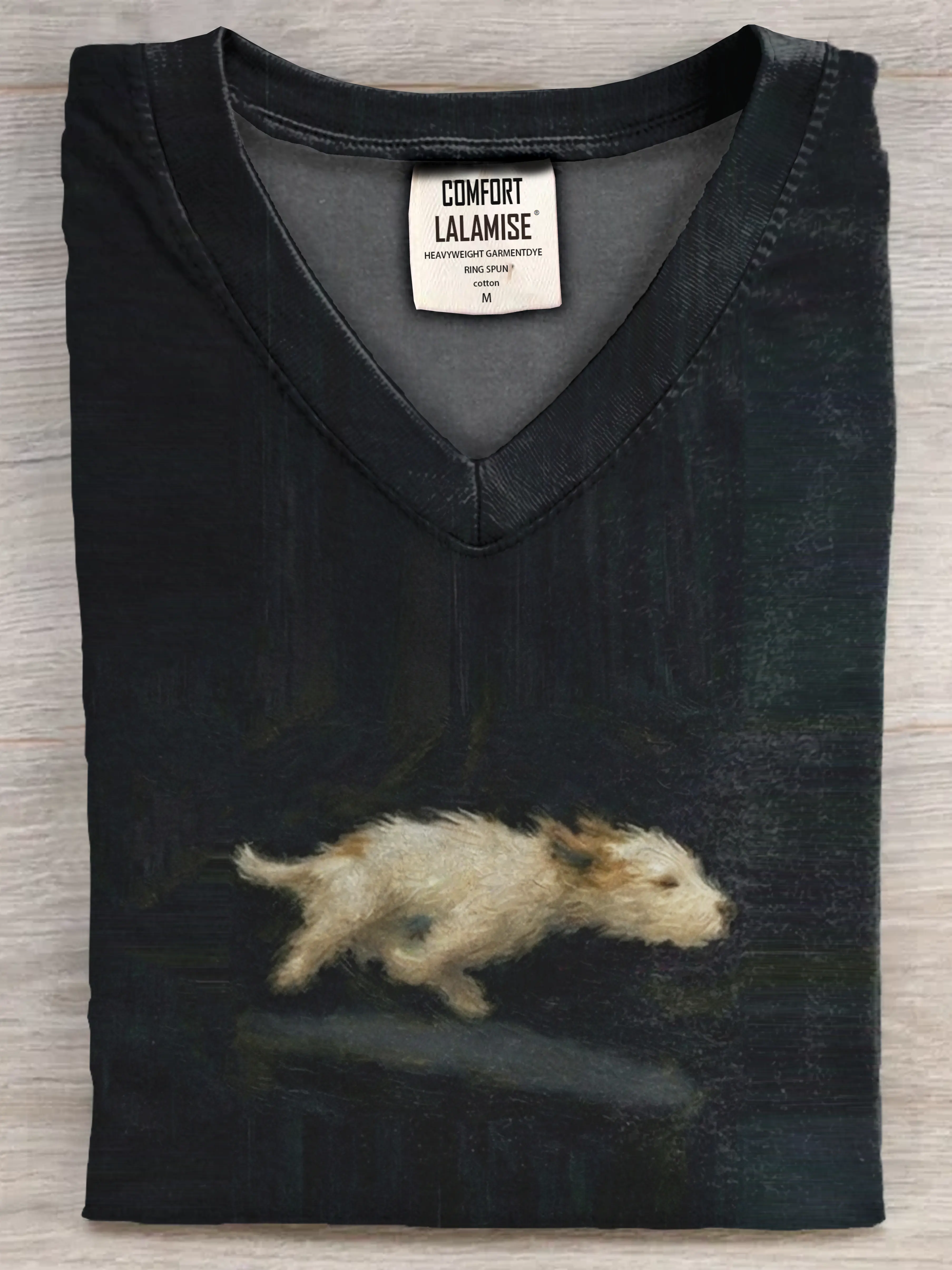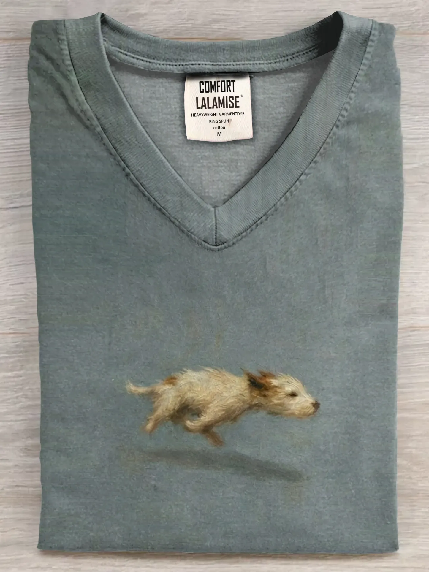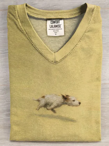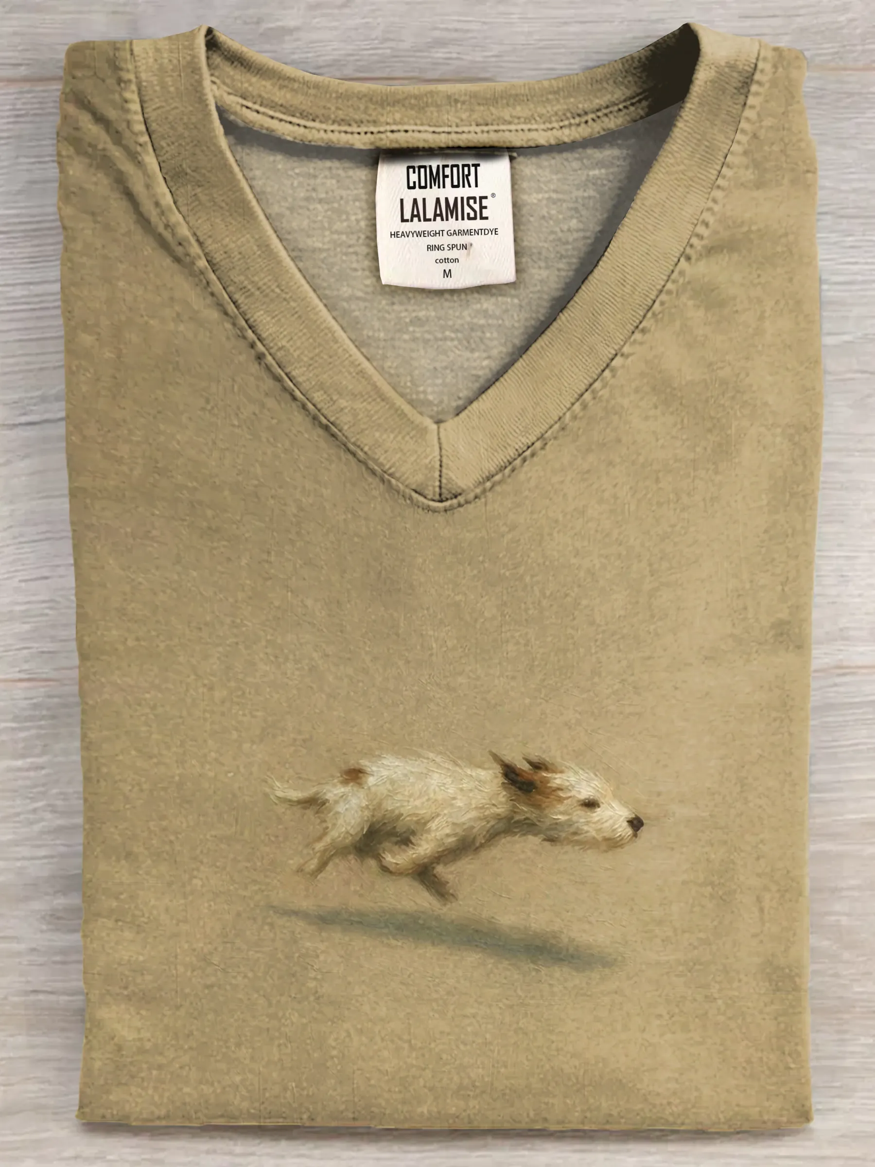 Funny Cute Running Dog Art Print V-neck Casual T-shirt
