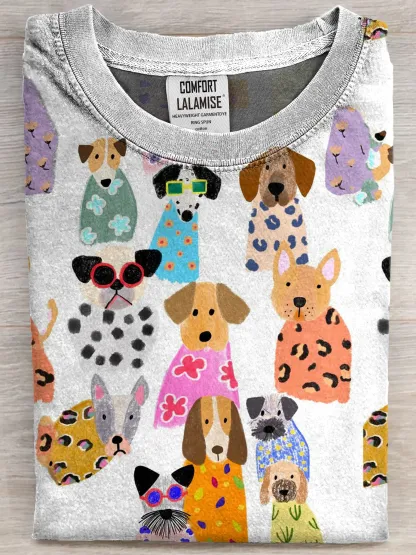Funny Retro Cute Dog And Cat Art Print Casual Cotton Short Sleeve T-shirt