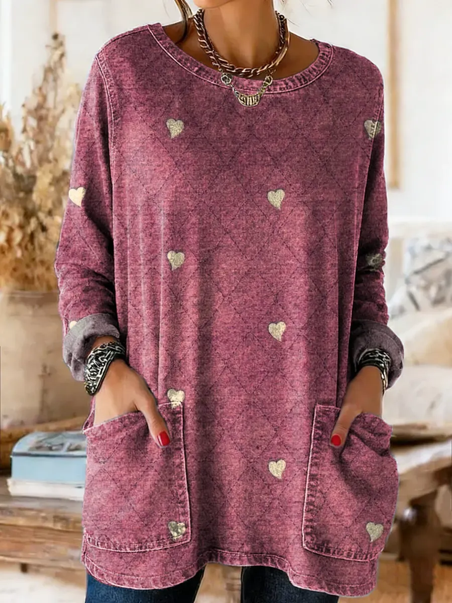 Heart-patterned Art Print Casual Washed Denim Cotton Top.