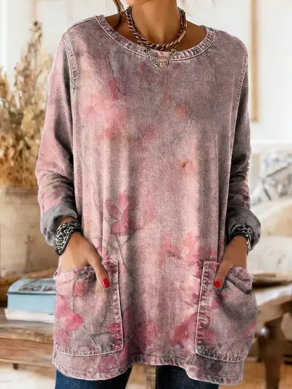 Pink Vintage Floral Art Print Casual Washed Denim Cotton Top